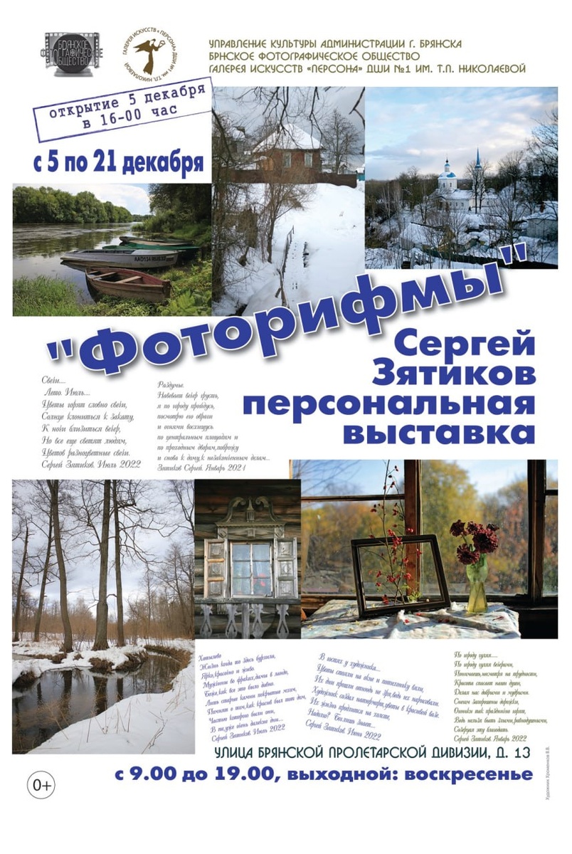 🔺В Брянске 5 декабря в галерее «Персона» ДШИ №1 им. Т.П. Николаевой откроется персональная выставка работ фотографа Сергея Зятикова. Экспозиция называется «Фоторифмы». Открытие запланировано на 16.00 🔺Творчество Сергея Зятикова отличает уникальная игра света, наполняющая снимки жизнелюбием и оптимизмом. Особенностью произведений фотографа также является особое внимание к деталям и текстурам, умение считывать неповторимость каждого прожитого момента. 🔺Экспозиция будет работать до 21 декабря. Афиша: Брянское фотографическое общество/В.Хроменков