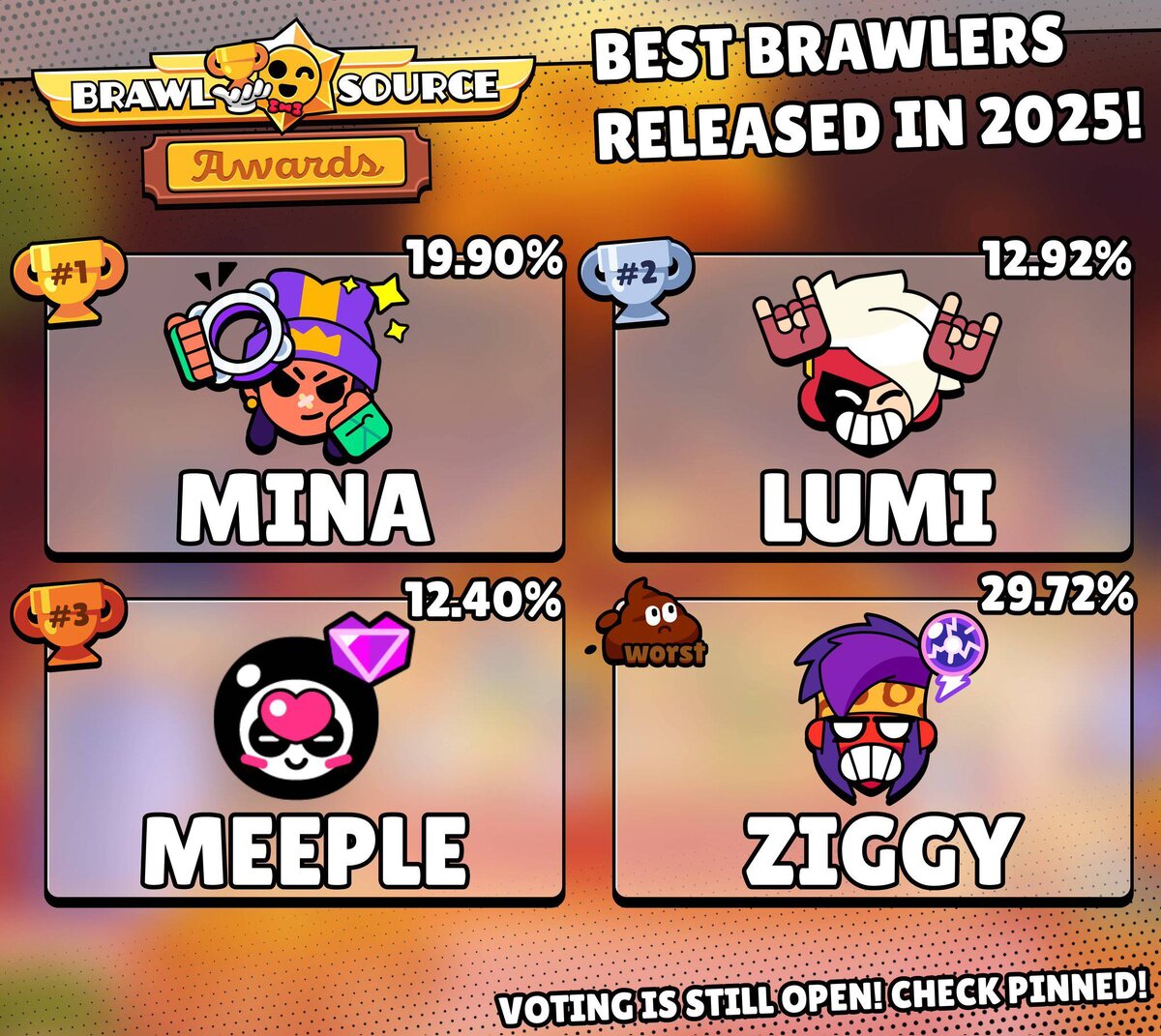 ⚡️ Эти бравлеры стали главными героями 2025 года: ⭐️ А вот Зигги оказался аутсайдером… ✅Новости по Clash Royale - ТЫК 😌Новости по Roblox - ТЫК Мир Supercell. Подписаться