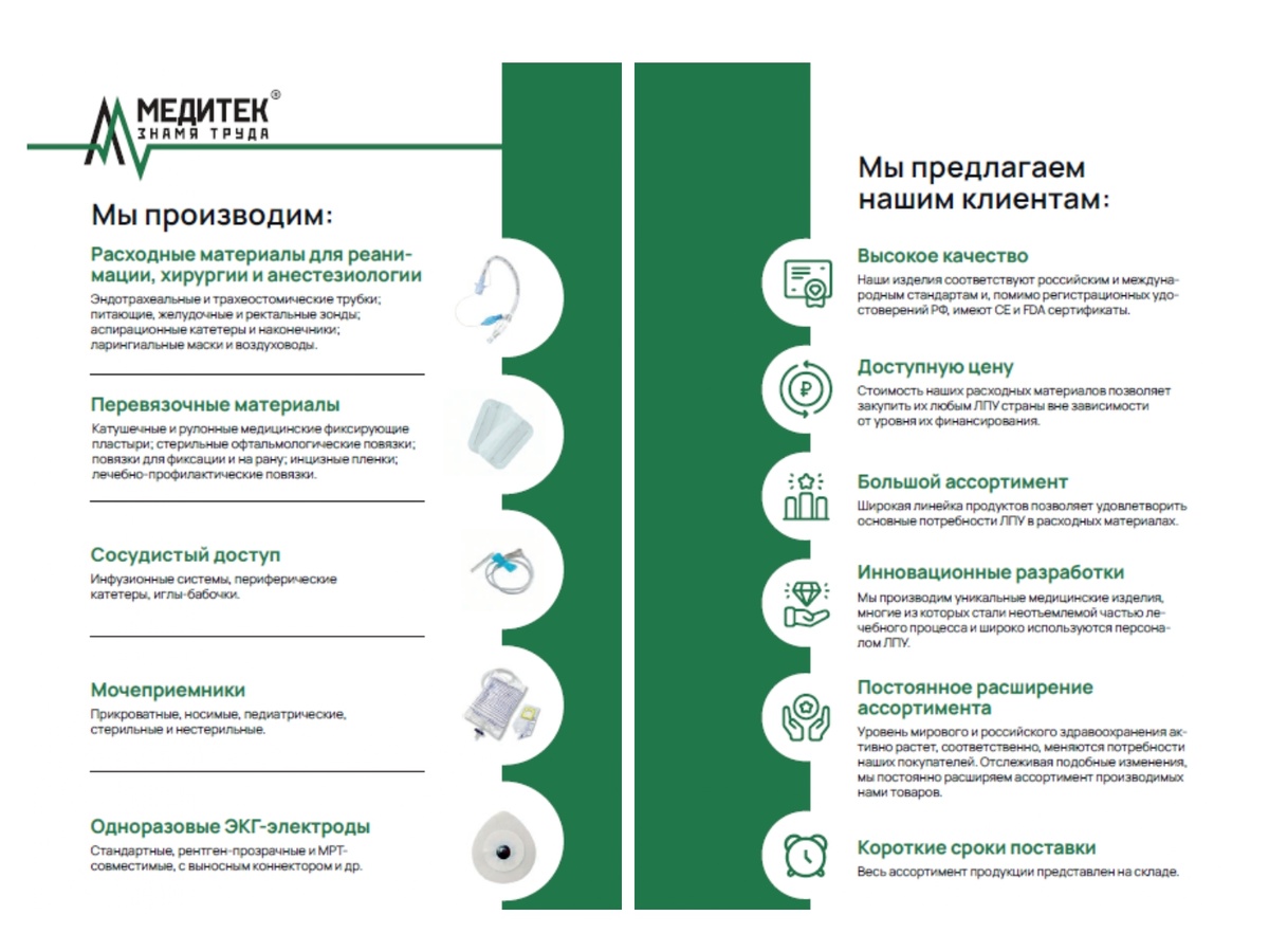 Компания «МЕДИТЕК «Знамя Труда» производит широкий ассортимент медицинских расходных материалов, которые значительным образом повышают возможности медицинского персонала, а так же создают наиболее комфортные условия лечения для пациентов. Все медицинские изделия соответствуют мировым стандартам качества и имеют всю необходимую разрешительную документацию. За более, чем 10-тилетнюю деятельность, продукция вошла в «тройку» самых покупаемых изделий медицинского назначения в России. Каждое второе лечебное учреждение страны использует продукцию компании «МЕДИТЕК «Знамя Труда» в повседневной практике. Мы производим: Расходные материалы для реанимации, хирургии и анестезиологии: • Эндотрахеальные и трахеостомические трубки; питающие, желудочные и ректальные зонды; аспирационные катетеры и наконечники; ларингеальные маски и воздуховоды. Перевязочные материалы: • Катушечные и рулонные медицинские фиксирующие пластыри; стерильные офтальмологические повязки; повязки для фиксации и на рану; инциз