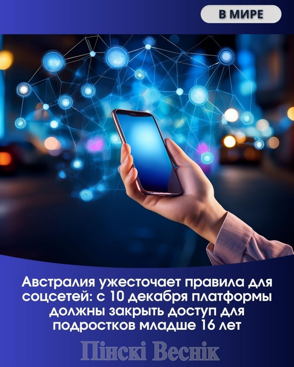 3️⃣ 1️⃣1️⃣1️⃣6️⃣ 🏷Австралия вводит новые правила для соцсетей с 10 декабря. Платформы должны закрыть доступ пользователям младше 16 лет, а существующие детские аккаунты — удалить или деактивировать. 📎Власти считают, что алгоритмы вредят здоровью подростков: 96% детей 10–15 лет в соцсетях; 7 из 10 видели вредный контент; каждый седьмой сталкивался с грумингом; более половины — с кибербуллингом. ✏️Под ограничения попадают: Facebook, Instagram, Snapchat, Threads, TikTok, X, YouTube, Reddit, Kick, Twitch. Список обновляется по критериям: фокус на онлайн-взаимодействии, возможность общения, размещение контента. Roblox и Discord уже внедряют возрастную проверку. Важно: ⏩С 10 декабря — доступ <16 запрещён. ⏩ Платформы обязаны удалять/деактивировать такие аккаунты. ⏩ Список сервисов может расширяться. @Пинский Вестник 📱Ютуб 📱ВК 📱ИНСТАГРАМ 📱ОК 📱ФЕЙСБУК 📱ТИК ТОК Прислать новость