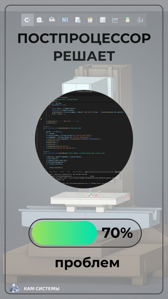 Это такая программа-посредник, которая берёт готовую траекторию обработки детали из вашей CAM системы и превращает её в понятный код именно для вашего станка или робота. Без неё ваш компьютер и станок друг друга не поймут. 🔗Откуда цифра «70%» ❓