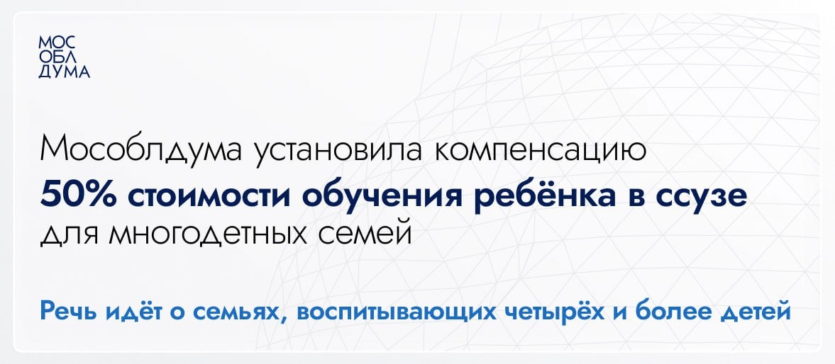 Мособлдума установила компенсацию 50% стоимости обучения ребёнка в ссузе для многодетных семей В ходе 124-го заседания Мособлдума приняла закон, которым установлена новая мера поддержки для многодетных семей. «С 1 января 2026 года в Подмосковье вводится ежегодная компенсация 50% стоимости обучения ребёнка в ссузе. Такая мера поддержки будет предусмотрена для семей, воспитывающих четырёх и более детей. Закон принят в рамках исполнения поручения Президента», – рассказал председатель Мособлдумы Игорь Брынцалов. ❗️Выплата будет предоставляться на каждого ребёнка, обучающегося по очной форме впервые. «Президент неоднократно подчёркивал, что семья, рождение детей – это основа основ нашего общества, залог будущего России. Поэтому принятый нами закон станет ещё одной составляющей комплексной поддержки многодетных семей в Подмосковье. Образование детей – одна из самых важных статей расходов в таких семьях. Компенсируя половину стоимости платного образования в колледжах и техникумах области,