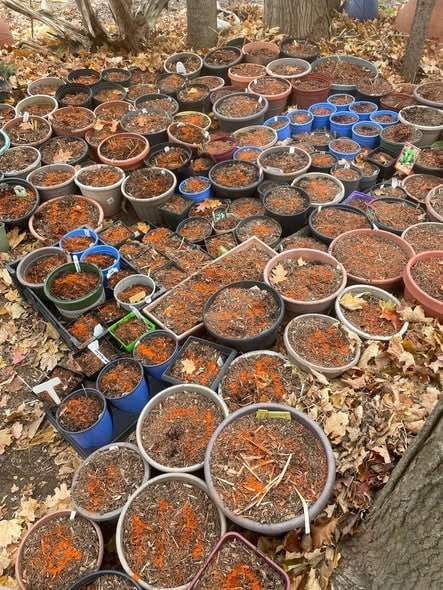 Такс, увидела новый способ зимовки.. вот это да...подумала я.. Robert Leask. Заполнил каждый горшок легким слоем мульчи, затем поперчил каждый кайенским перцем, чтобы не допустить поедания.