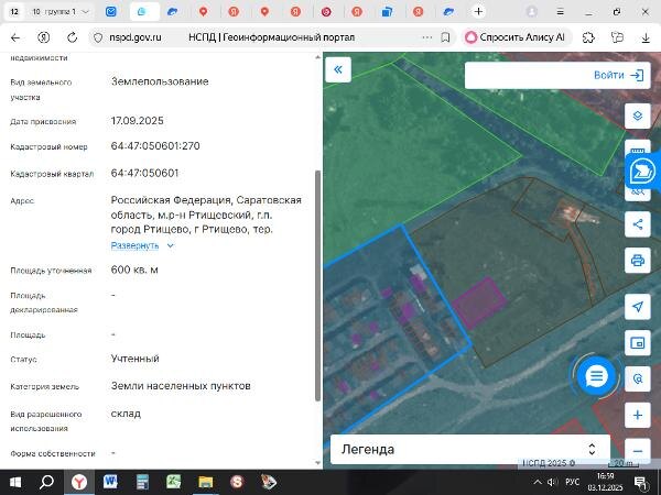 Название: Земельный участок площадью 600 кв.м., кадастровый номер 64:47:050601:270 с разрешенным использованием "склад", расположенный по