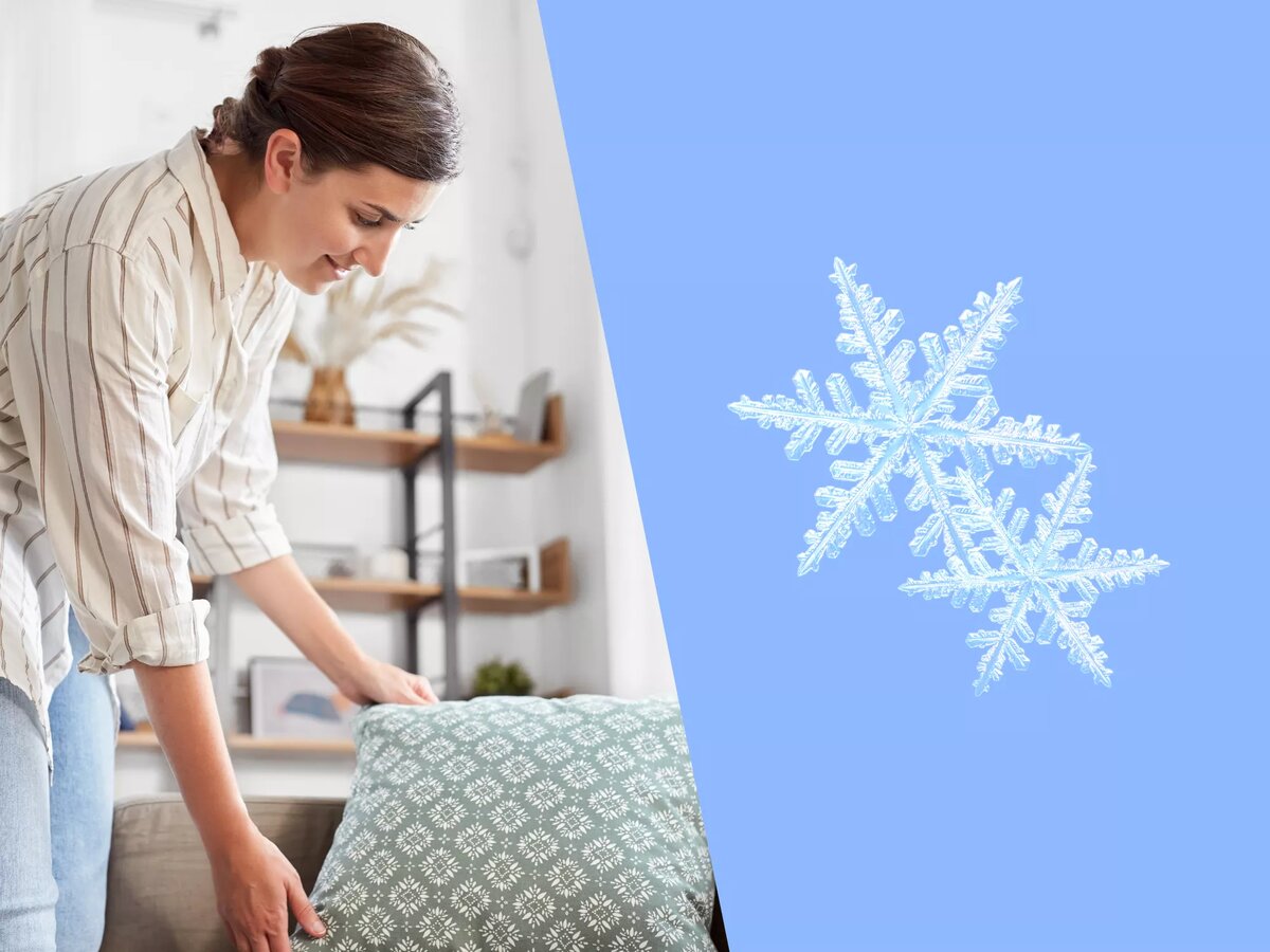 Во-первых, достаньте пледы: холодными зимними вечерами они обязательно пригодятся. Во-вторых, замените наволочки на декоративных подушках. Выберите сезонные с новогодним или зимним принтом. В-третьих, постелите ковры: они сделают пространство еще теплее и уютнее.