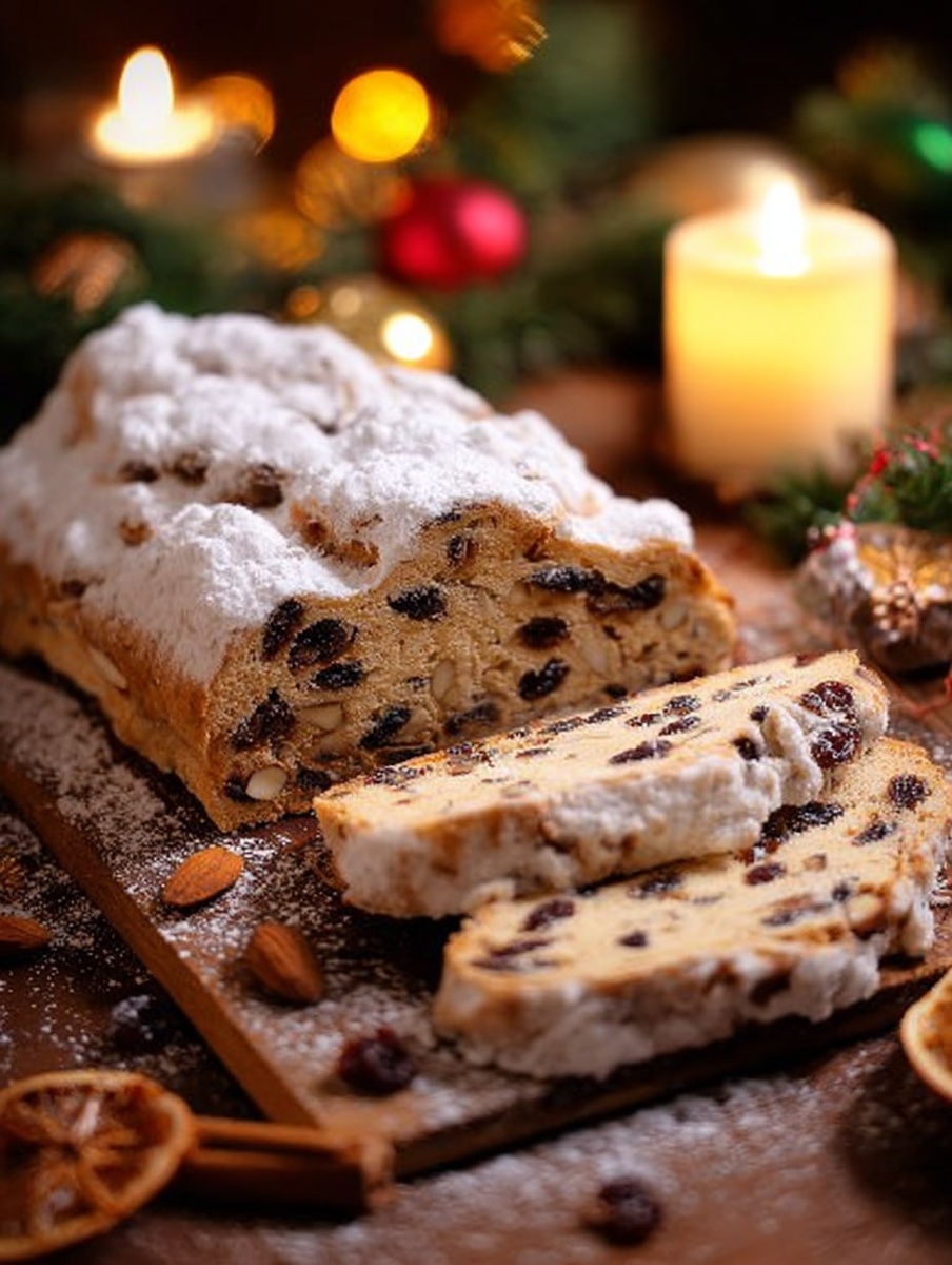 Рождественский штоллен 🕒 Время приготовления: 5 часов 🍽 Порций: 24 🔥 Калорийность: 240 кКал на порцию Рецепты немецких штолленов в большинстве случаев предполагают очень сдобное и плотное дрожжевое тесто, множество сухофруктов и специфичную форму готового изделия. Готовый штоллен отлично хранится, это один из тех пирогов, которые замечательно печь заранее к празднику. 🧂 Вам понадобится: Изюм тёмный — 175 г Клюква сушёная — 100 г Миндаль — 100 г Ром светлый — 100 мл Молоко — 100 мл Мука пшеничная — 500 г Дрожжи сухие быстродействующие — 5 г Сахар (песок) — 100 г Сливочное масло — 200 г Ванильный сахар — 1 ч. л. Цедра лимонная тёртая — 1 ч. л. Сахарная пудра — 100 г 👩🍳 Приготовление 1️⃣ этап Ингредиенты 1-го этапа: Изюм тёмный — 175 г Клюква сушёная — 100 г Миндаль — 100 г Ром светлый — 100 мл Замочите сухофрукты в роме на полчаса, затем добавьте орехи и перемешайте. 2️⃣ этап Ингредиенты 2-го этапа: Молоко — 100 мл Мука пшеничная — 50 г Дрожжи сухие быстродействующие — 5 г
