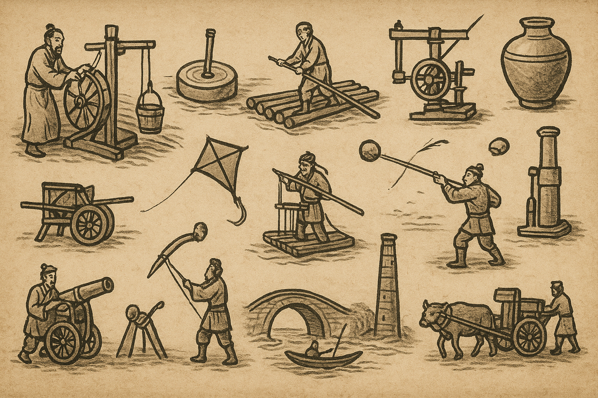 Осмотрелись китайцы в реальности и, устав от непроизводительного труда, соорудили цепной водоподъемник с ножным приводом. После этого поняли, что руками молоть зерно слишком утомительно и сделали жерновую мельницу. Дальше - больше. Не на себе же мешки таскать, и сделали китайцы сплавной плот, выяснив предварительно в патентной службе, что такового изобретения на планете до них никто не делал. А в связи с таким прогрессом понадобилось поднимать производительность по всему контуру, потому сварганили раньше всех воздуходувные мехи поршневого типа.