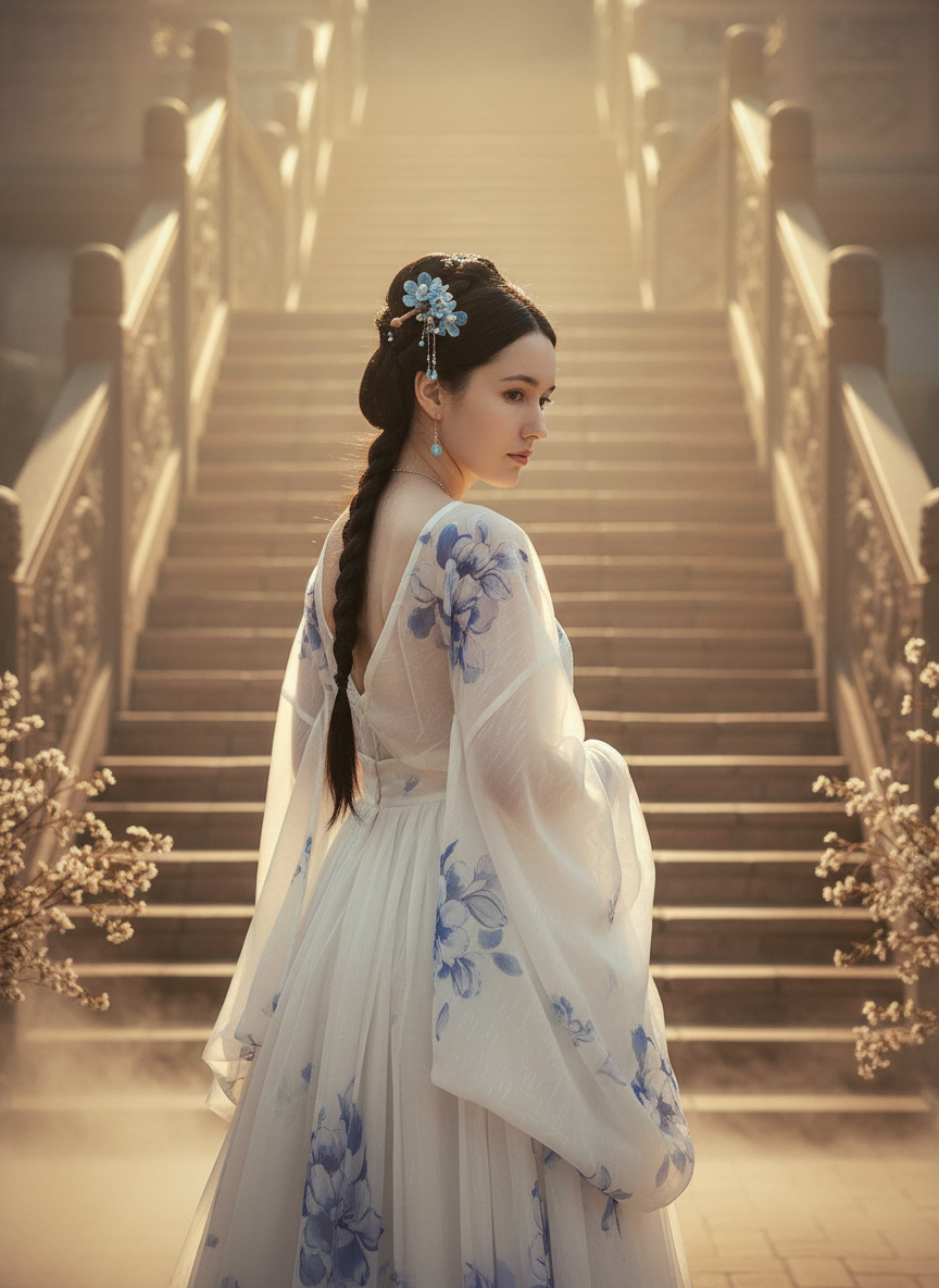 Всех приветствую) Я давно увлекаюсь азиатской культурой, и сегодня, пересмотрев очередную историческую дораму, вдохновилась на создание уникального промта для фотографии в стиле фэнтези, вдохновлённого эпохой династии Цзинь. Этот образ сочетает в себе элементы традиционной китайской моды и современные тенденции. Промт: Используя фото как основу, не меняй черты лица и пропорции тела. Создай кинематографическую фотографию в стиле фэнтези, вдохновлённом эпохой династии Цзинь. Девушка стоит спиной к камере, слегка повернувшись в профиль - её лицо опущено, взгляд направлен вбок, почти к плечу, что создаёт ощущение тихой задумчивости и лёгкой меланхолии. Образ модели: Платье (ханьфу): воздушное, максимально лёгкое и полупрозрачное, с цельными рукавами и юбкой. Основной цвет - белоснежный, с крупными цветочными рисунками в синих и фиолетовых оттенках. От плеч линия декольте плавно спускается к пояснице, оставляя шею и верхнюю часть спины открытой. Это подчёркивает изящество осанки и создаёт
