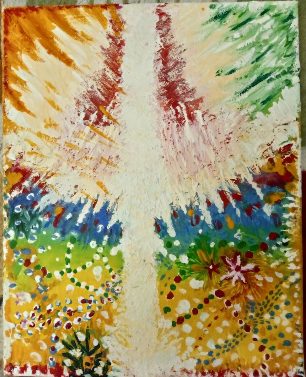 Потянуло меня на рисование, и как итог, сотворил картину, как говорится, маслом. И гуашью. Назвал ее Стяжание Духа! И вот стало мне интересно, а что увидит в ней нейросеть. И вот ниже прошу ознакомиться с результатом. Общее впечатление и композиция Картина представляет собой абстрактное изображение, выполненное яркими, насыщенными цветами. В центре композиции — широкий вертикальный столб белого цвета, который тянется от нижнего края к верхнему. Этот столб доминирует в картине, разделяя пространство на две условно симметричные части. Вокруг белого столба расположены красочные мазки и пятна, образующие нечто вроде сияющего ореола или сада. Цветовая палитра и символика Белый цвет: Центральный белый столб является ключевым элементом. Белый цвет в духовном контексте часто символизирует чистоту, свет, божественность, просветление и духовную истину. Он может представлять собой путь к духовному пробуждению или канал связи с высшим разумом. Желтый и оранжевый: Эти цвета расположены в нижней ч