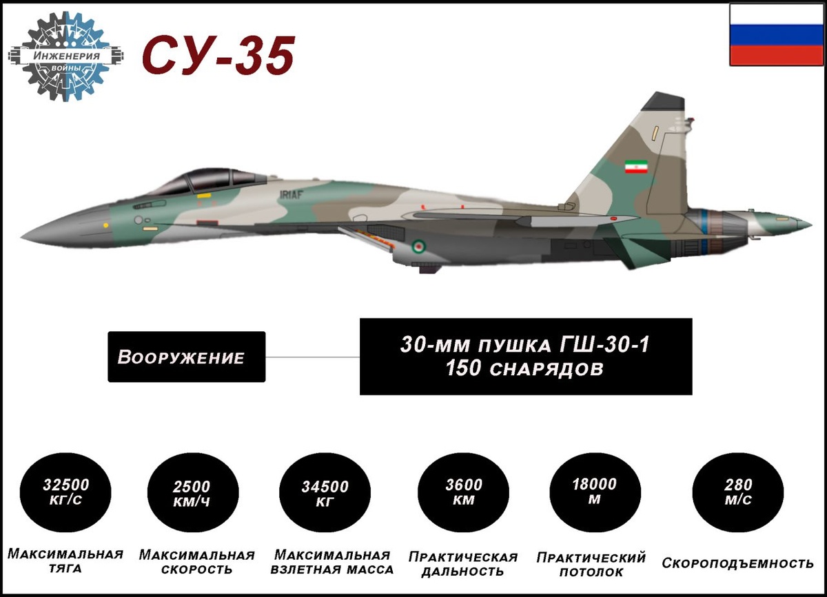 Россия поставит партию Су-35 стране БРИКС Иран заказал у России 16 истребителей поколения «4++» со сроками поставки до 2027 года Особенности Су-35: ► Су-35 обладает впечатляющей максимальной боевой нагрузкой - 8000 кг на 12 узлах подвески; ► В арсенал истребителя входят ракеты класса «воздух-воздух» Р-77 и Р-27, а также корректируемые бомбы КАБ-500; ► Су-35 превосходит истребители поколений «4 и 4+» - Rafale, Eurofighter 2000, F-15, F-16 и F-18. ⚠️ По предварительной информации, Иран уже полностью оплатил заказ Инженерия войны⚔️