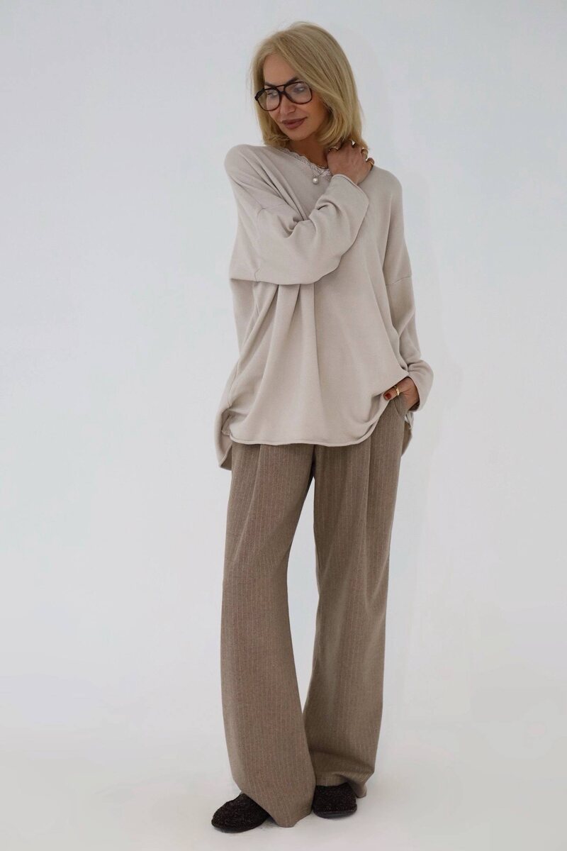 Туника с кружевом — 4900₽ Размер: oversize Состав: 80% вискоза, 20% шерсть 📌Размерная сетка: Мерки туники с кружевом: Длина изделия: 77 Ширина: 73 Длина рукава: 39 Классические брюки в полоску — 4500₽ Размеры: M, L, XL Состав: 85% шерсть, 15% пэ 📌Размерная сетка: Мерки классических брюк в полоску: — Размер М: Резинка: 35-46 Объем бедер: 110 Длина: 110 — Размер L: Резинка: 36-48 Объем бедер: 116 Длина: 113 — Размер XL: Резинка: 37-50 Объем бедер: 120 Длина: 110 На модели брюки размера: L Параметры: 96/68/96 / 182 Пишите нашему менеджеру @Matrosova (+79022237939)