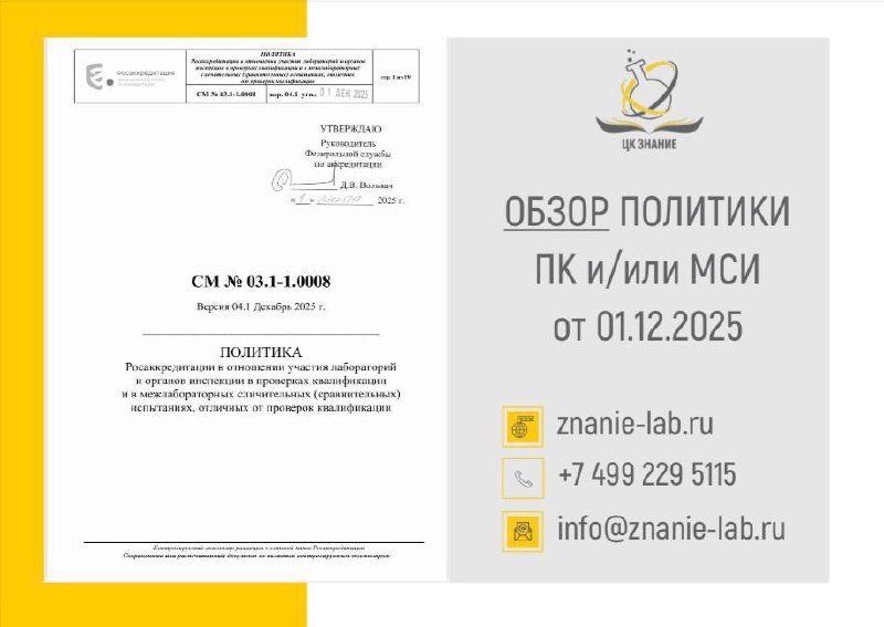 Новая редакция Политики ПК и/или МСИ. СМ № 03.1-1.0008 от 01.12.2025 (Версия 04.1 Декабрь 2025 г.). Переводим формулировки: ⚡️ПК – это МСИ с аккредитованными провайдерами, в том числе зарубежными. ⚡️МСИ, отличные от ПК – МСИ, организованные не для целей ПК (в соответствии с ISO/IEC 17043:2023 Введение, пп. «h», «i», «j»): 🔸оценка рабочих характеристик метода измерения или испытания, например, совместные испытания для целей аттестации методики; 🔸приписывание значений стандартным образцам; 🔸ключевые и дополнительные сличения, проводимые метрологическими и иными уполномоченными институтами. ⚡️МСИ (альтернативные методы проведения мониторинга) - это «междусобойчики»: 🔸МСИ, организованные существенным количеством лабораторий на разовой или постоянной основе; 🔸организация МСИ с небольшим количеством участников. Также обращаем внимание на следующие изменения: 🔸изменено определение «межлабораторные сличительные испытания», добавлены два новых определения: «метод исследований (испыт