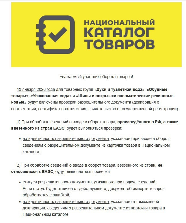 ‼️ с 13/01/2026 включается сверка РД при вводе в оборот и заполненность РД в карточках товаров. Уже давно ЧЗ оповещал о том, что заполнение РД в карточках товаров для групп "Обувь, духи, вода, шины" обязательно при вводе в оборот. С 13/01/2026 включается проверка соответствия этому требованию для этих товарных групп. Мы же все понимаем, что и для других товарных групп также включится аналогичная проверка. Соответственно, очень важно сейчас подготовиться и проверить Ваши РД на соответствие, чтобы не столкнуться с проблемами при вводе в оборот. Освежить память по РД и на что обратить внимание, можно посмотрев наш прямой эфир —> https://dzen.ru/media/it_mps/kollegi-publikuiu-zapis-priamogo-efira-po-razreshitelnoi-dokumentacii-ot-14112025-6919aeef0ea32c24c370cd31 ‼️Много еще было дезинформации, что якобы с 30/11/2025 аннулируют Киргизские сертификаты. Чтобы разобраться в этом вопросе нужно обратиться к ПП РРФ № 1669 (с 30.11.2025), который вступает в силу с 30/11/2025, и посмотреть ка