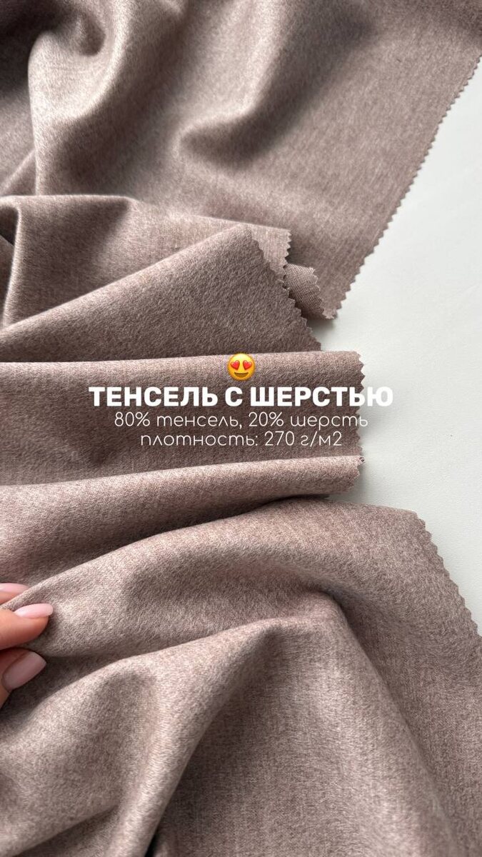Потрясающий тенсель с шерстью😍 Разной плотности, разных оттенков♥️ Очень приятный на ощупь, бархатистый и нежный! Слегка переливается. Смотрится потрясающе✨ На фото тенсель с шерстью «кофе с молоком» и «сталь» • Состав: 80% тенсель 20% шерсть • Плотность: 270 г/м2 • Ширина: 148 см 2800,00 ₽/м