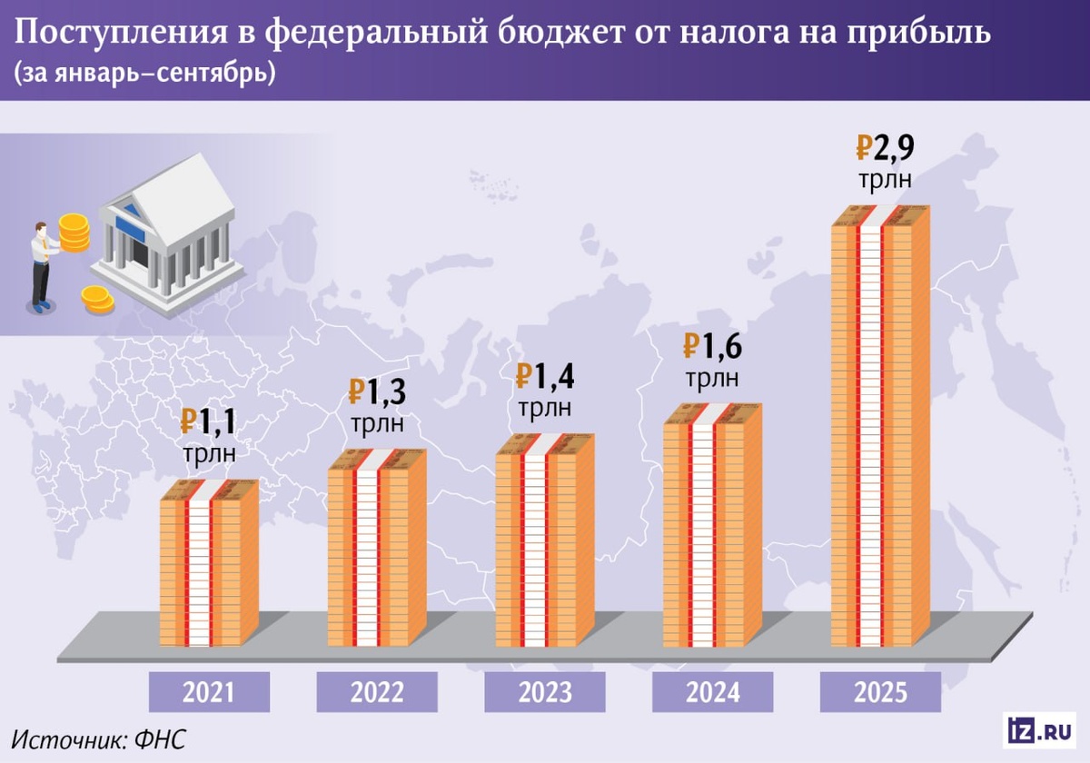 Поступления от налога на прибыль в федеральный бюджет за девять месяцев 2025-го увеличились на 82% по сравнению с аналогичным периодом