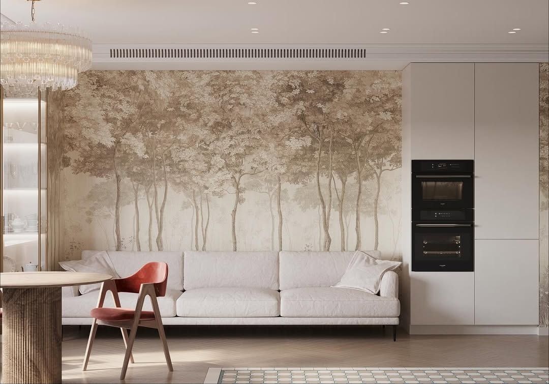Интерьер кухни - гостиной выполнен в современном стиле с элементами минимализма и природной эстетики. Центральным акцентом комнаты являются обои из коллекции #Wallpaperpart1@affrescoru (арт. AF951-COL3) с изображением леса в приглушённых бежево-коричневых тонах. Такой рисунок создаёт ощущение лёгкости и воздушности, визуально расширяет пространство и добавляет интерьеру нотки природной гармонии. Дизайнер @tuvman_tatyana Тувман Татьяна - Посмотреть фрески, панно, обои и ткани можно в нашем интернет магазине. 📞 8-800-555-31-51 📨 Salon@affresco.ru 🌏 affresco.ru ⏰ Срок изготовления от 5 раб дней 🚀 vk.com/affrescoru ✈️ https://dzen.ru/id/5f710c51fe660a4af44007cb - #affrescoru #affresco #аффреско #фрески #обои #фотообои #обоидлястен #дизайнинтерьера #wallpaper #mural #фрескиназаказ #affrescoruвинтерьере #wallart #muralart #designinterior #настенныеобои #wallmural