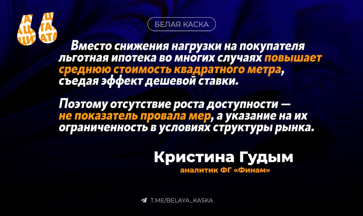 Кристина Гудым, аналитик ФГ «Финам» В своей оценке доступности жилья ЦБ зафиксировал умеренный рост показателя в 2025 году, однако за этим улучшением стоят не структурные факторы. Рост доступности — во многом статистический эффект замедления цен и стабилизации ставок после резкого ужесточения денежной политики. При этом ситуация с льготными программами принципиально не меняется: доступность жилья для семейной ипотеки застыла на уровне примерно 45 кв. м, несмотря на государственные субсидии последних лет. Фактически это означает, что льготные программы перестали быть инструментом расширения доступности. Их влияние на конечную стоимость нивелируется ростом цен на первичном рынке, который частично вызван именно наличием льготного спроса. Вместо снижения нагрузки на покупателя льготная ипотека во многих случаях повышает среднюю стоимость квадратного метра, съедая эффект дешевой ставки. Поэтому отсутствие роста доступности — не показатель провала мер, а указание на их ограниченность в услов