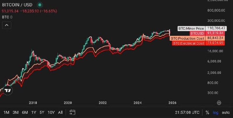 Биткоин никогда не падал ниже своей “электрической цены”. И вот эту фразу рынок сейчас проверяет на прочность так же жёстко, как проверял нас в марте 2020-го, ноябре 2022-го и всех предыдущих циклах. Смотрю на эту метрику и понимаю: перед нами снова тот самый кадр, где толпа паникует, а структура — спокойная, как старый механический метроном. У него свой ритм. Своя логика. Свой цикл. Данные говорят просто: себестоимость электроэнергии для майнеров — около 71 000 долларов. И за всю историю биткоин ни разу не закреплялся ниже этой зоны. Мог касаться, мог колоть, мог пугать… но не уходил туда телом свечи, потому что у сети есть жёсткий “биологический инстинкт выживания”. Почему это важно? Это не магический уровень, не “гарантия” и не обещание роста. Это про другое — про глубинный закон сети. Когда цена приближается к себестоимости электричества, майнеры сокращают мощности, слабые игроки капитулируют, сеть перестраивается… и рынок получает новую точку опоры. Что это значит? Что перед