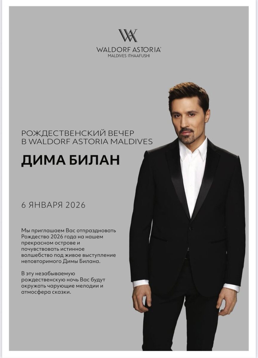 ✨ РОЖДЕСТВЕНСКИЙ ВЕЧЕР В WALDORF ASTORIA MALDIVES ✨ 6 января 2026 у вас есть невероятная возможность встретить Рождество на одном из самых роскошных островов мира — Waldorf Astoria Maldives Ithaafushi 5*. И в эту сказочную ночь вас ждёт живое выступление Димы Билана — под открытым небом, под шум Индийского океана. Представьте: тёплый вечер, чарующие мелодии и атмосфера праздника, которая останется в сердце навсегда. ✨🎶 🎄 Новый год! Периоды проживания: 27.12.2025 — 03.01.2026 (7 ночей) 2 взрослых В стоимость входит: — трансфер на яхте — налоги — завтраки — праздничный новогодний ужин — праздничный New Year Day Brunch Варианты размещения: 🌱 Overwater Villa with Pool — 55 575$ 💰 🌱 Grand Reef Villa with Pool — 60 955$ 💰 🎄 Рождество! 05.01.2026 — 12.01.2026 (7 ночей) 2 взрослых В стоимость входит: — трансфер — яхта — налоги — питание — завтраки — праздничные ужины: Православный Рождественский ужин 🌱 Overwater Villa with Pool (описание виллы на сайте отеля) 49 360$ 💰 📹 Об