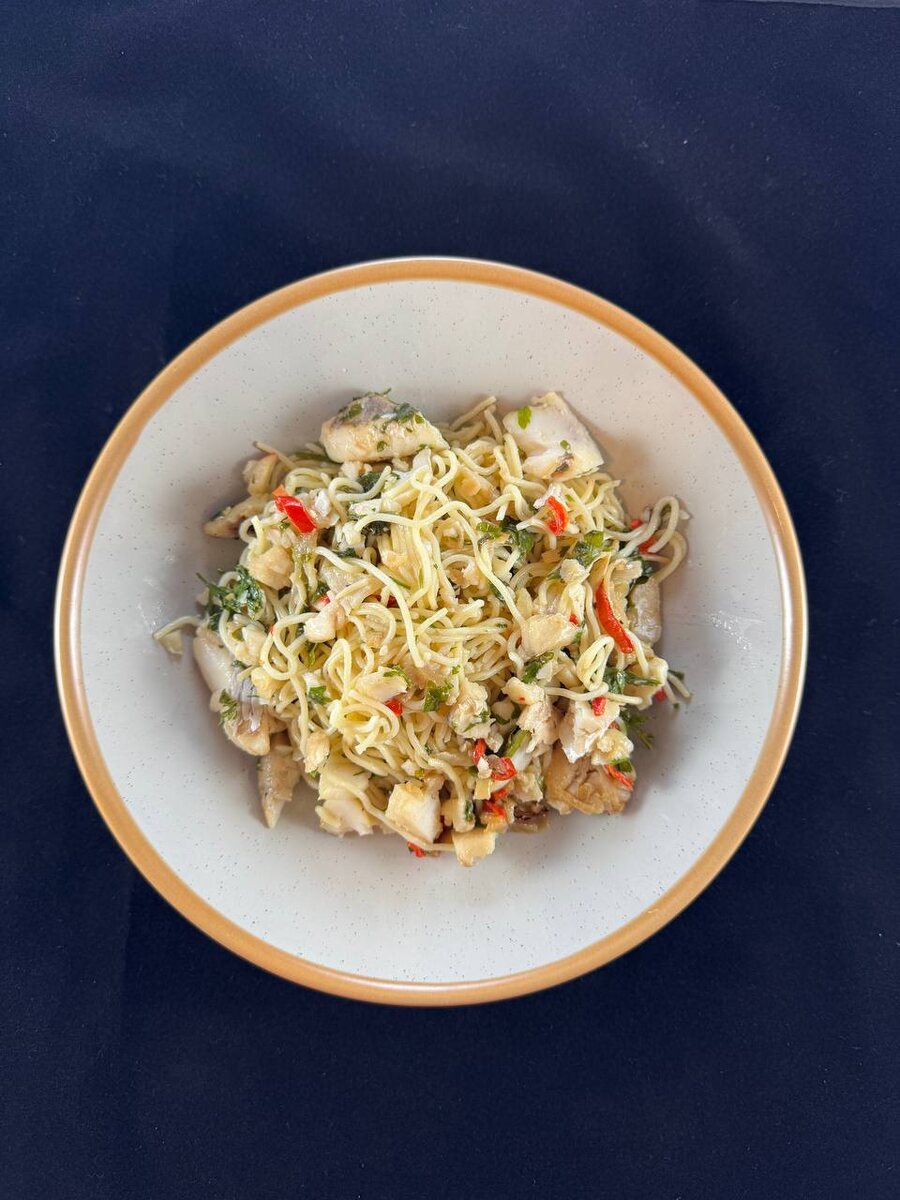 Спагетти с судаком Судака поймал сам, потому и с судаком. Вы можете взять любую малокостистую рыбу. Ингредиенты: 1️⃣ Филе судака - 600 гр 2️⃣ Перец болгарский - 1 шт 3️⃣ Лук репчатый - 1 шт 4️⃣ Масло растительное - 2 ст.л 5️⃣Петрушка - пучок 6️⃣ Сок и цедра 1/2 лимона 7️⃣ Тимьян - 1 ч.л 8️⃣ Чёрный перец - 1/2 ч.л Для спагетти: - 400 грамм спагетти - 4 литра воды - 40 грамм соли Приготовление: Блюдо моментальное, поэтому делаем всё быстро, после того, как поставим закипать воду. 1. Режем филе кусочками 5х3 см 2. Обжариваем на растительном масле с одной стороны. На среднем огне. Я делал это на сковороде из нержавейки и без муки. Главное, предварительно, хорошо разогреть сковороду, чтобы капля воды не испарялась, а бегала маленьким шариком (где-то на канале писал об этом). 3. Перевернув кусочки добавляем четверть-кольца лука и такую же по размеру соломку из болгарского перца. Выжимаем сок лимона, перчим и добавляем тимьян. Помешивая обжариваем лук и перчик между кусочками. Кусочки не