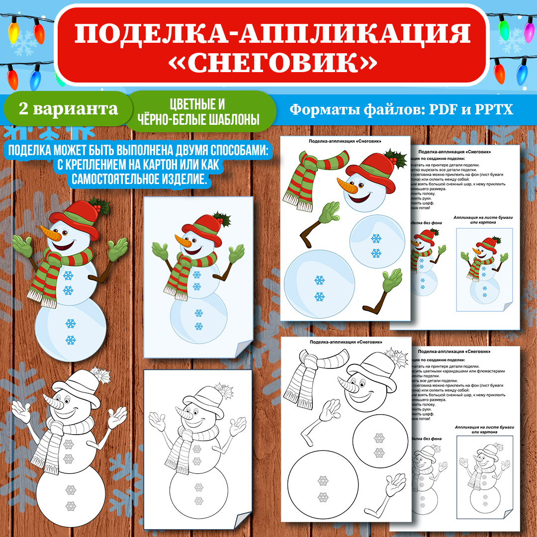 Что вы получите в комплекте (4 листа А4): Чёрно-белые шаблоны — ребята раскрасят снеговика по своему вкусу. Цветные шаблоны — сразу готовы к вырезанию и склеиванию. Пошаговая инструкция. Примеры готовых работ — с фоном и без, чтобы вдохновиться и создать свою уникальную версию. СКАЧАТЬ материал можно здесь. -----------------------------------------
