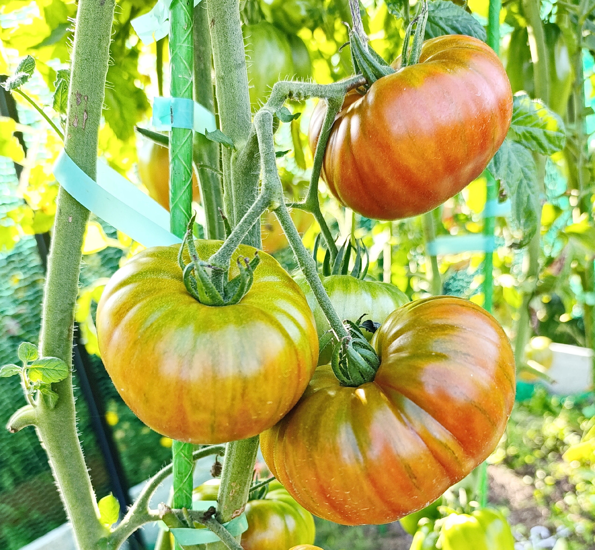 Индетерминантный, достаточно высокорослый даже в ОГ, куст крепкий мощный. По срокам считается поздним-среднепоздним. Завязывался хорошо, кисти не сбрасывал, что очень удивительно. Крупные плоскоокруглые плоды, чуть присборенные сверху, в меру сочные, у меня были классического вкуса. Обязательно повторю в надежде получить тот самый восхитительный вкус, о котором часто пишут.
