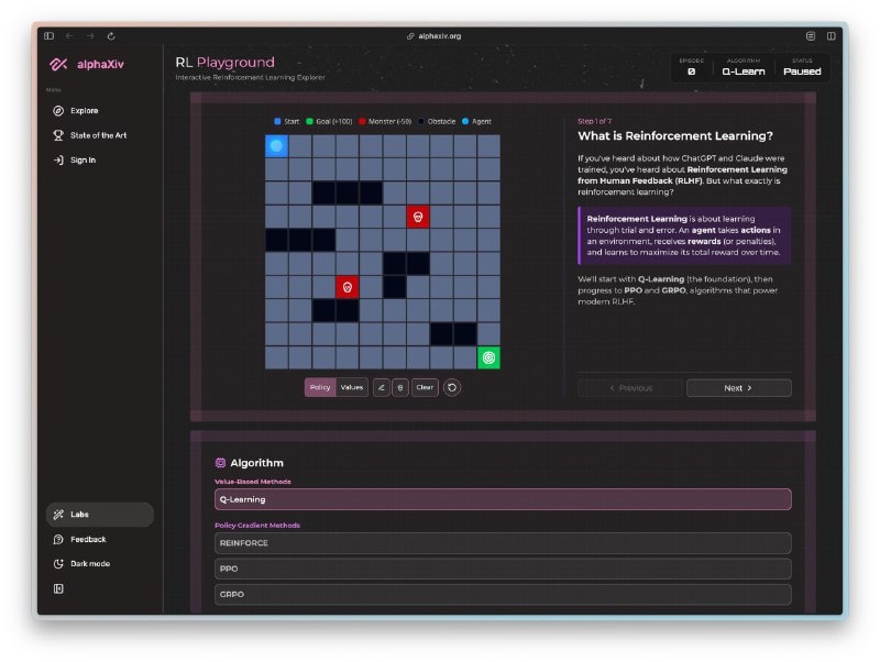 Появился интерактивный тренажер для изучения различных алгоритмов обучения нейронных сетей — RL Playground от AlphaXiv
