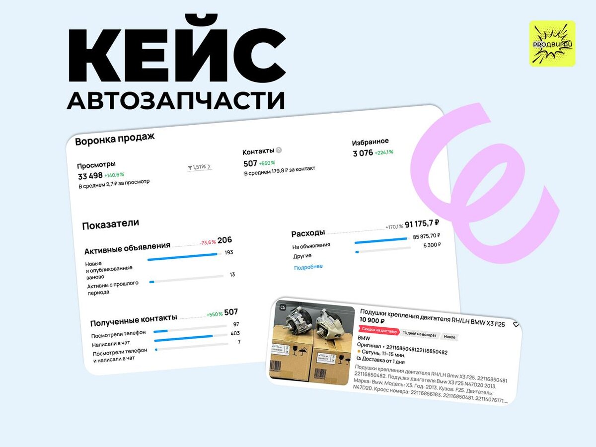 🛞 Кейс: Автозапчасти на Авито Друзья, здравствуйте! Сегодня хотим поделиться классным результатом в нише автозапчастей. Клиент пришел 3 месяца назад с запросом "стабилизировать и масштабировать Авито, как основной канал продаж". Раньше пробовали вести кабинет самостоятельно и с помощью фрилансеров, но стабильных и масштабируемых результатов добиться не получалось. Результаты на входе: Контакты ≈ 160шт/мес Конверсия в контакт ≈ 0.9% Стоимость контакта ≈ 350 руб. Рекламный бюджет ≈ 55000-60000 руб./мес Спустя 3 месяца мы вышли на улучшение всех показателей: Контакты +220%🔺 Стоимость контакта -50%🔻 Конверсия в контакт +65%🔺 ____________ Мы работаем в совершенно разных нишах, скорее всего, работали и в вашей. Не стесняйтесь, если нужен взгляд со стороны — обращайтесь. Проведем аудит ниши или вашего действующего кабинета, подсветим точки роста, ответим на вопросы. Это полезно и полностью бесплатно! Так же не забывайте о нашей Библиотеке Знаний - хранилище бесценной информации,