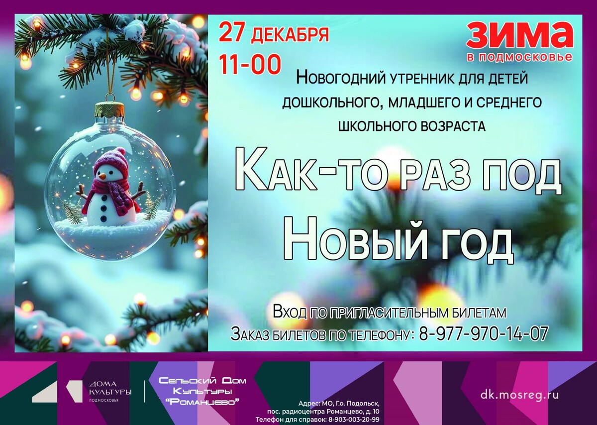 ✨ Новогодний утренник «Как-то раз под Новый Год»! 🎄🎅🎁❄️Вас ждут захватывающие конкурсы и задорные игры. А самое главное — конечно же, встреча с Дедом Морозом и Снегурочкой, которые обязательно принесут подарки каждому участнику мероприятия. 🎫Вход по пригласительным билетам! 📲По вопросам приобретения пригласительных билетов обращаться по телефону: 8-977-970-14-07 🚫 Возраст: 0+ 📆 27.12.2025 🕒 11:00 🏢 Дом культуры "Романцево" 📍 г.о. Подольск, посёлок Радиоцентра Романцево, 10 ⭐Поддержать канал голосом 🍰Где поесть в Подольске ✅ Мероприятия Подольск https://dzen.ru/id/66ed500f7b5671493eca3fd6 http://vk.com/podolsk_events http://dzen.ru/podolsk_events