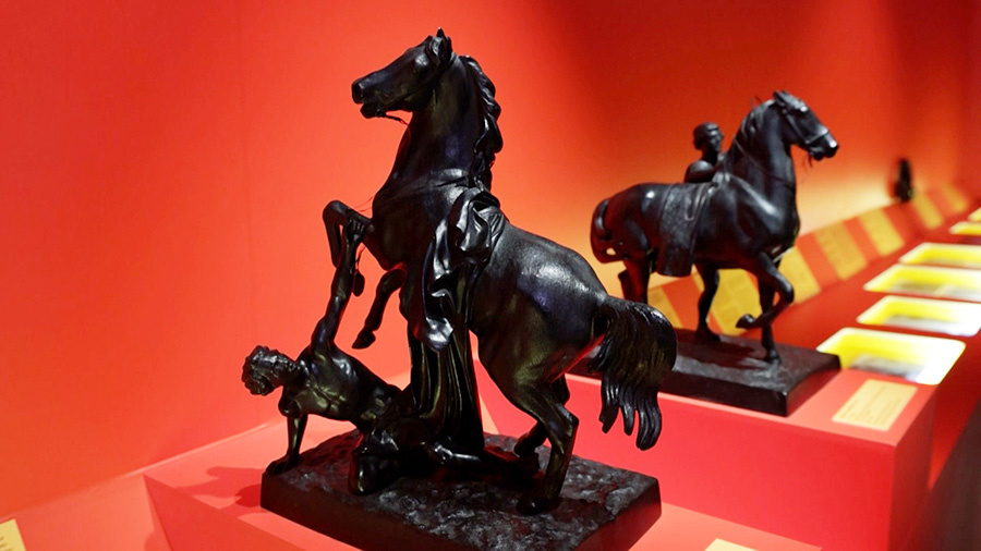 © АО "ТВ Центр" Петербург не представить без творений барона Клодта. Одно из самых известных - скульптурная группа на Аничковом мосту. Работы были так хороши, что император Николай I дарил их то прусскому королю, то королю Сицилии. И Клодт отливал новые. Укрощение коней - борьба человека с силами природы. Так и сам скульптор покорил гипс и бронзу. Первая монументальная работа Петра Клодта венчает Нарвские триумфальные ворота. Шесть лошадей, запряженных в колесницу Славы. Их стремительная энергия как символ торжества и победы. А в зале - буквально под копытами лошадей - выставка к юбилею русского скульптора. "Работа Клодта, жизнь Клодта - это бесконечный конвейер, подготовка моделей, отливка моделей. Несколько лет идет эта работа, именно так - вверх ногами отливается эта фигура. 21 тонна металла должна затечь во все мельчайшие детали, и тогда вот эти бесконечно повторяющиеся шедевры встают на улицах города", - пояснила Наталия Яблонская, куратор выставки "Рыцарь бронзы". Красные стен