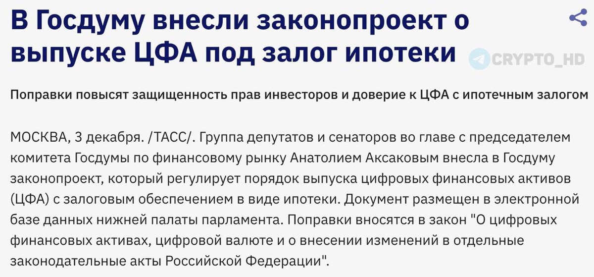 🇷🇺 В Госдуме предложили разрешить выпуск ЦФА под залог недвижимости
