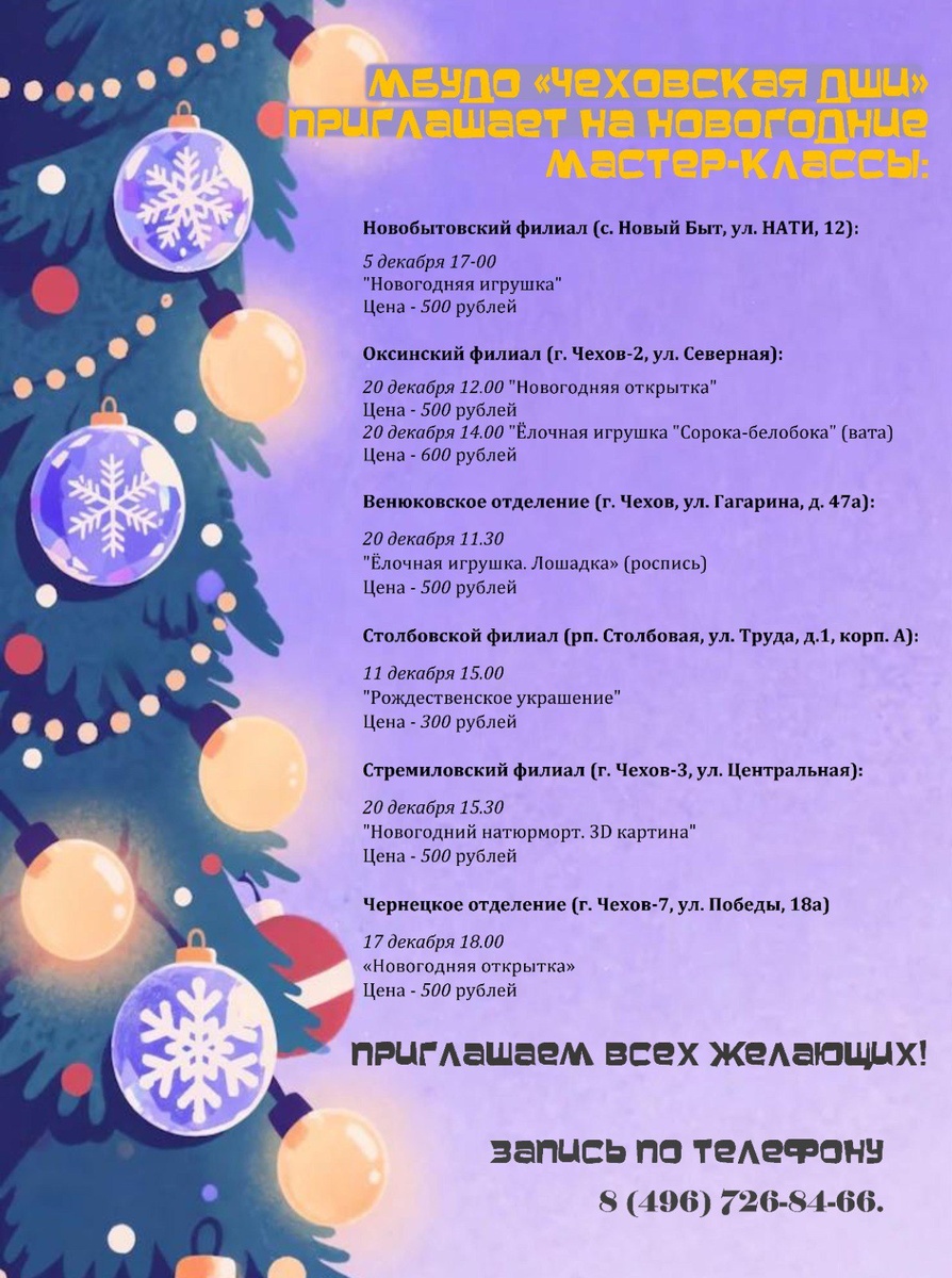 ✨ 🎄Мастер-классы в Чеховской ДШИ🎄 ❄️Приближается Новый Год, а значит, пора готовить подарки и запасаться новогодним настроением🎄 Ждём вас в наших филиалах и отделениях🎉 Запись по телефону 📲 8(496)726-8466 🚫 Возраст: 6+ 🏢 Чеховская детская школа искусств 📍 г.о. Чехов 💰 Цена от: 300 до 600 ₽ ⭐Поддержать канал голосом ✅ Мероприятия Чехов https://dzen.ru/id/66cc4b48e9ef144699238a51 http://vk.com/chekhov_events http://dzen.ru/chekhov_events