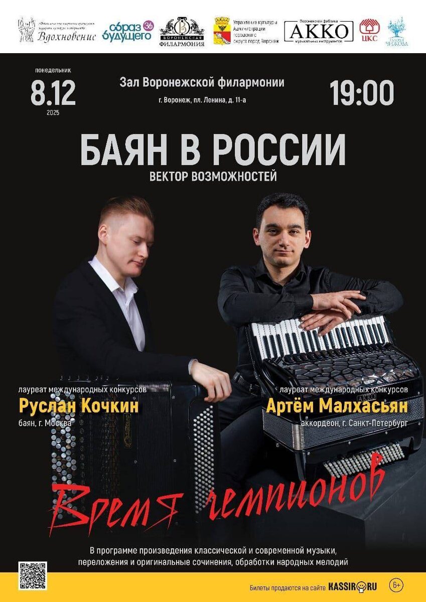 🔥Время чемпионов : баян и аккордеон, которые взорвут Ваше представление о музыке! Друзья❗На сцене Воронежской филармонии - музыкальный взрыв! Выступят два виртуоза: 🪗Артём Малхасьян ( аккордеон, СПб) - Чемпион Мира! 🪗Руслан Кочкин( баян, Москва) - Чемпион России! 📅 Когда:8 декабря в 19:00 . 🏛️Где: Воронежская филармония. 👏В программе концерта " Время чемпионов"- от классики до современных хитов. Идеально для ценителей музыки и для семейного похода с детьми! Ломаем стереотипы: народные инструменты - это круто и современно! Билеты и подробности по ссылке☝️ https://vrn.kassir.ru/koncert/kontsertnyiy-zal-filarmonii/bayan-v-rossii-vektor-vozmojnostey_2025-12-08