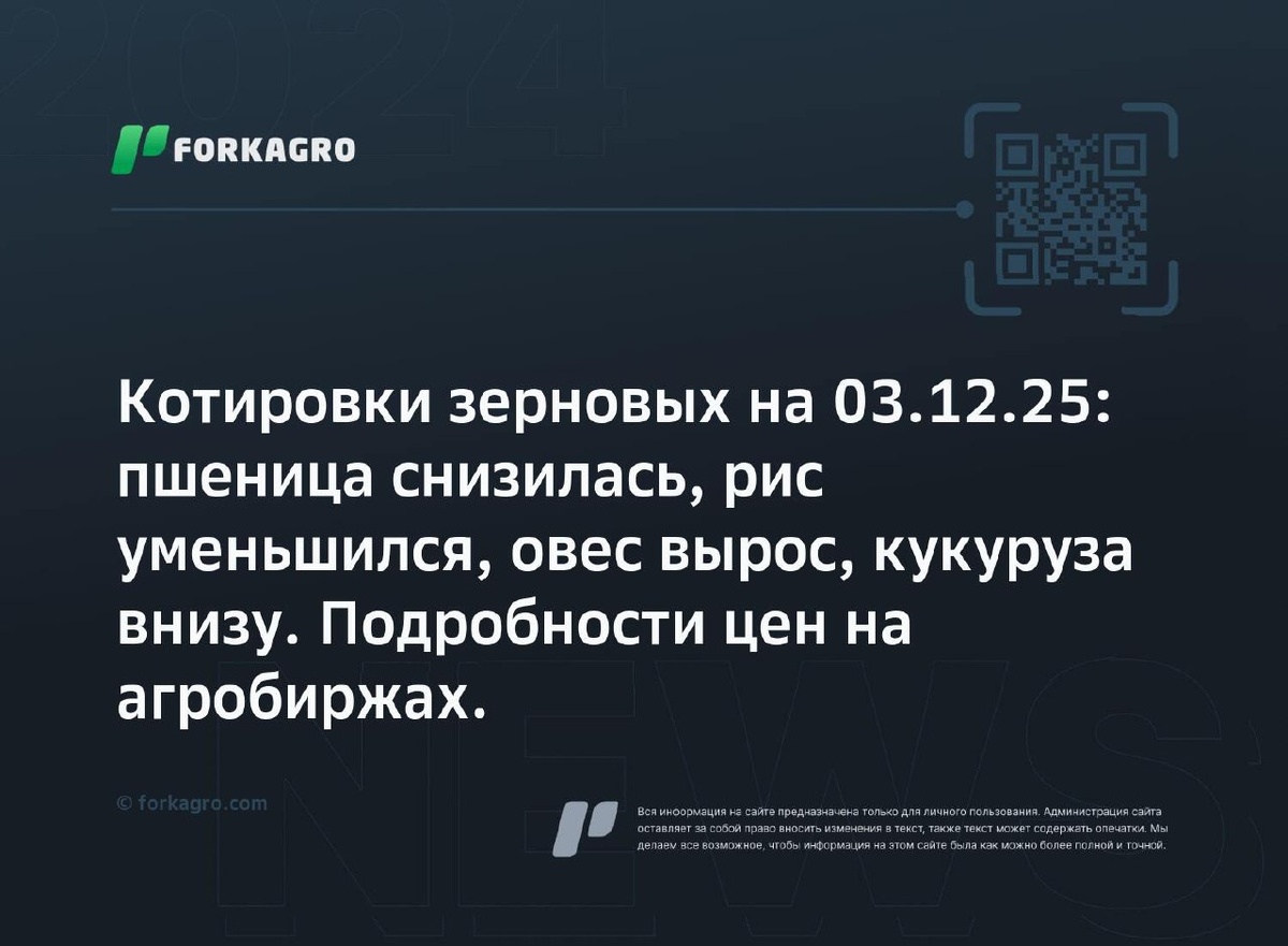 Котировки зерновых на 03.12.25: пшеница снизилась, рис уменьшился, овес вырос, кукуруза внизу