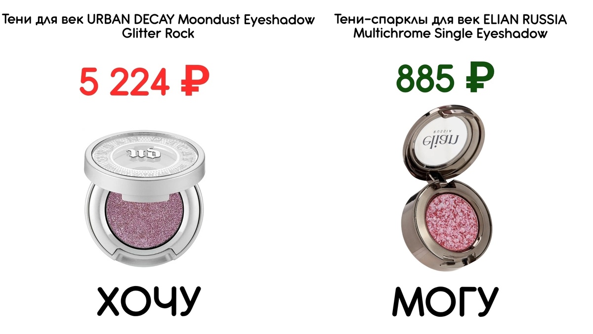 В преддверии праздников рекомендую красивые блестящие тени в благородном оттенке фиолетового. Напоминаю, что блестящие тени может наносить девушка в любом возрасте! В небольшом количестве их можно использовать каждый день, тем более – в праздники, когда все вокруг сияет и сверкает! ✨ ВАЖНО! Конечно же, блестящие тени (любого цвета, даже если они коричневые) НЕ СМОГУТ создать эффект коррекции нависшего века. Если веко у вас нависшее: ➡️ сначала нанесите матовые коричневые тени, ➡️ а на подвижное веко – блестящие тени любого цвета. Чтобы тени в этом случае лучше передавали цвет, их можно наносить пальчиком, а не кистью. Хочу: Тени для век URBAN DECAY Moondust Eyeshadow Glitter_Rock, цена - 5224 рубля. Могу: Тени-спарклы для век ELIAN RUSSIA Multichrome Single Eyeshadow, цена - 885 рублей.