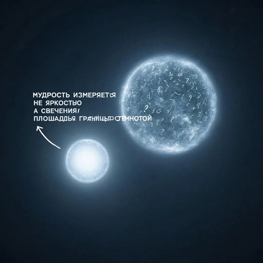 Ошибка восприятия: Знание — это наполненный сосуд. Чем больше налил — тем умнее. Истина Сократа: Знание — это сфера, погруженная в океан незнания. Ценность — не в объёме, а в площади контакта с неизвестным. Представь два квантовых поля в безграничном вакууме: · Малое поле — уверенность дилетанта. Яркое, чёткое, но замкнутое. Ему кажется, что оно исчерпало реальность в своих границах. · Большое поле — знание мудреца. Оно в десятки раз обширнее, но его периметр — это фронт вечного вопроса. Каждая новая частица знания увеличивает не ответы, а площадь касания с тайной. --- 🔬 КВАНТОВЫЙ ОБРАЗ: Твоё сознание— это детектор, плавающий в океане тёмной информации (всё, чего ты не знаешь). Каждое новое знание — это вспышка света на детекторе. Дилетант радуется: «Смотри, сколько света! Я всё вижу!». Мудрец видит: «Каждая вспышка освещает лишь то, как бесконечно огромна тьма вокруг. Но именно этот контраст и есть зрение». Чем ярче твой свет, тем яснее видишь масштаб тьмы. И это — не отчаяние.