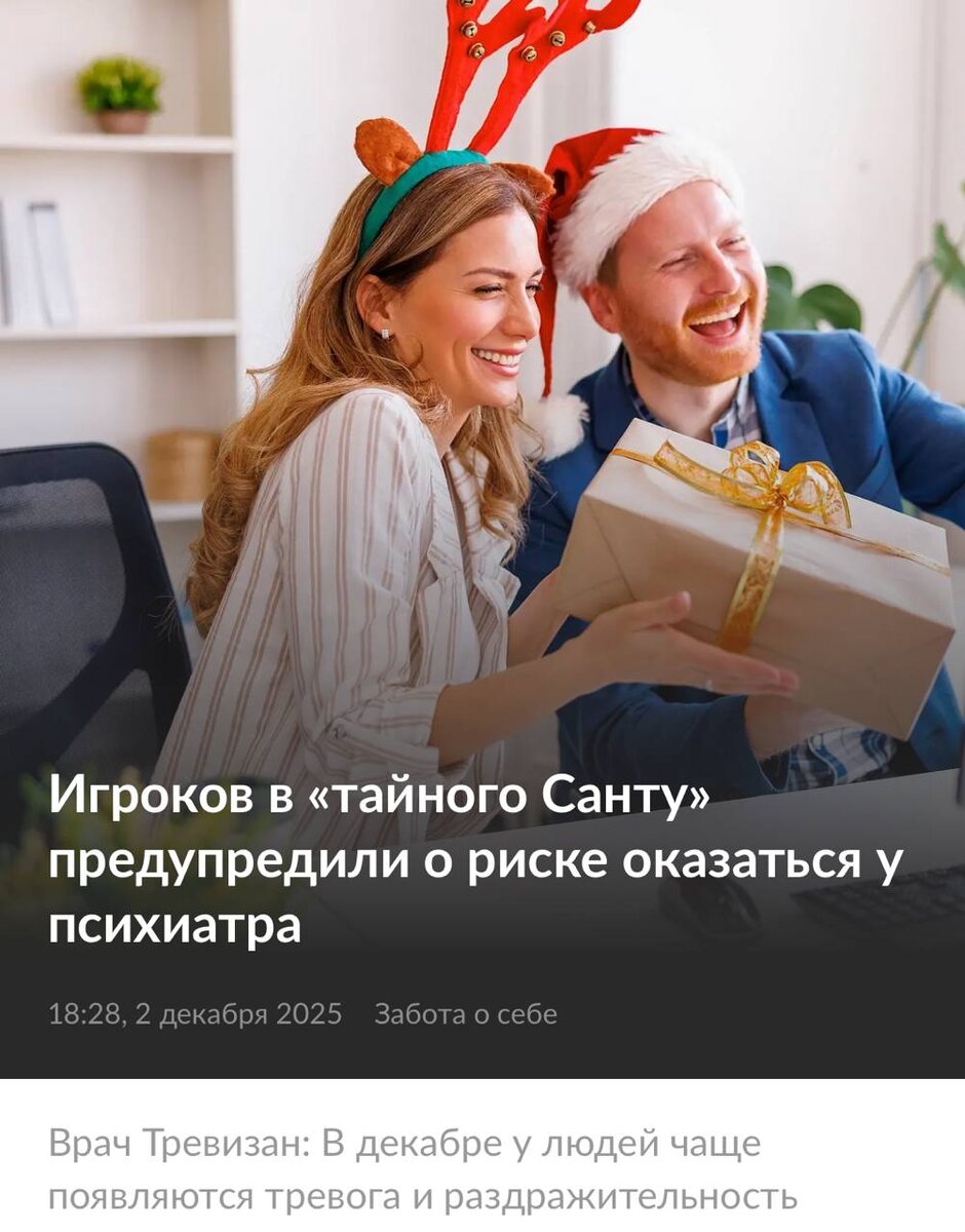 Тайный Санта отправляет в ДУРКУ — психологи предупреждают, что игра вызывают тревогу и раздражение у коллег. Декабрьские развлечения под давлением бьют по психике сильнее, чем кажется. Лимит по цене почти никогда не спасает — у людей проседает самооценка и растёт обида. Врачи прямо говорят: сочетание корпоративов, «Санты» и обязательных встреч повышает риск обращения к психиатру. Отмазываемся этим постом 😫 CtrlAltDelights- подписаться