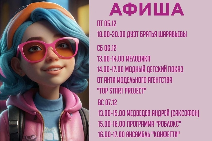 Встречаем первые зимние выходные вместе с ТРЦ «Карнавал»! Как всегда подготовили для вас разнообразную развлекательную программу: Смотрите афишу и приезжайте в ТРЦ «Карнавал» Будет по-зимнему весело! Пятница, 5 декабря 18:00 - 20:00 Дуэт «Братья Шаравьевы» Суббота, 6 декабря 13:00 - 14:00 Мелодика 14:00 - 17:00 Модный детский показ от Анти модельного агенства «TOP START PROJECT» Воскресенье, 7 декабря 13:00 - 15:00 Андрей Медведев (саксофон) 15:00 - 16:00 Программа «Роблакс» 16:00 - 17:00 Ансамбль «Конфетти» 17:00 - 18:00 Ансамбль «Сюрприз» Ждём вас! Вход свободный! 5 - 7 декабря, ТРЦ «Карнавал» (ул. Халтурина, 55, 3 этаж, сцена в зоне фудкорта)