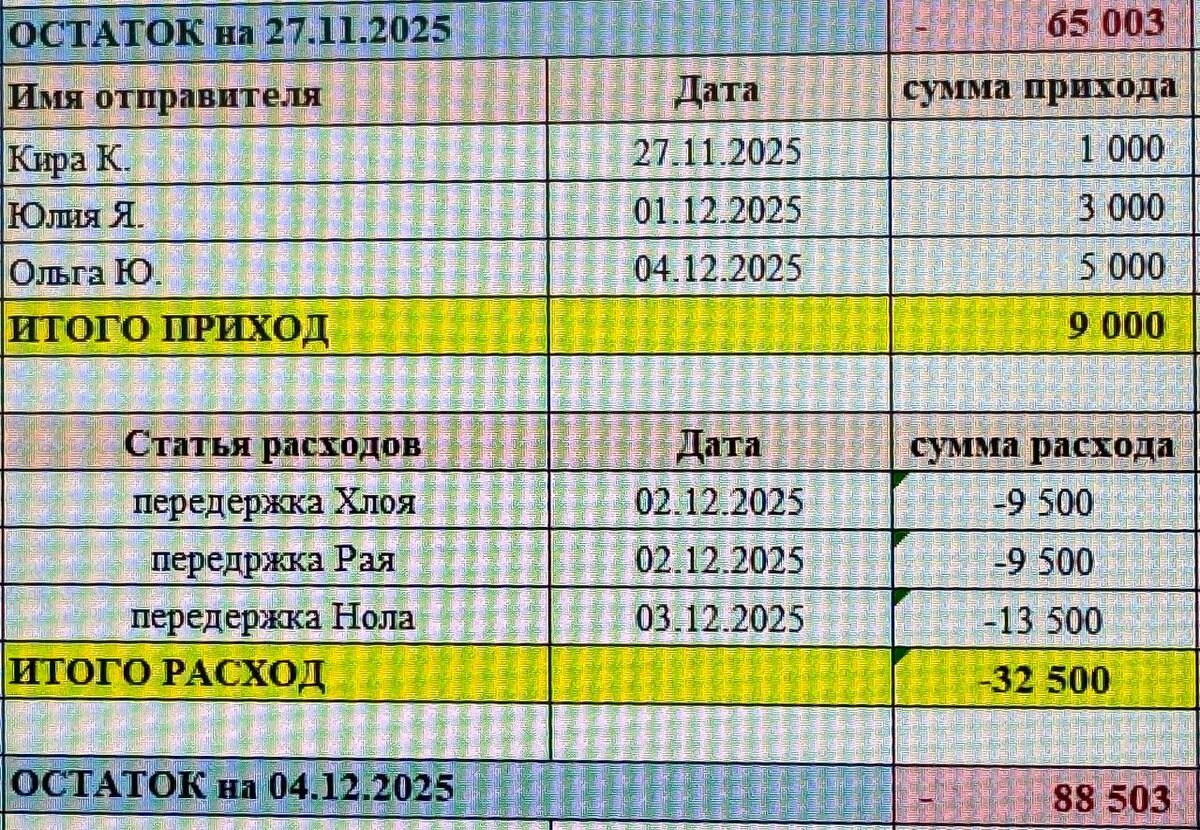 #Отчет 04.12.2025 Благодарим Вас 🙏 за помощь хвостикам 🐕🦺🐕🦺🐕🦺🐕 Собираем средства на погашение долга и за передержку 🙏 на январь 2026 Ханни 14500 оплачена Нола 13500 оплачена Хлоя 9500 оплачена Рая 9500 оплачена ‼️ еженедельно можно поехать и познакомиться с хвостиками Карты привязаны к номерам телефонов: +7 985-977-03-22 Альбина (Сбер, Тинькофф) +7 916-069-34-82 Елена (Сбер) Подпись: «для собак» или «благотворительность»