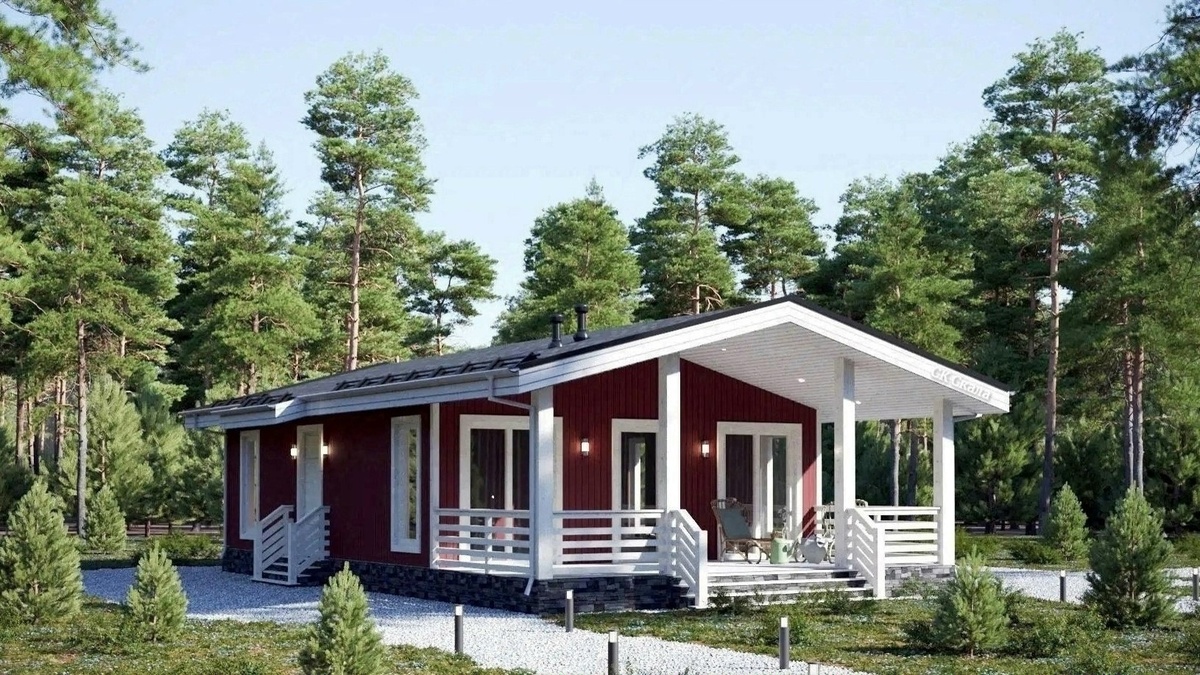 Одноэтажный дом включает всё необходимое для комфортного дачного отдыха с семьёй или друзьями: прихожую, 2 спальни, большую кухню-гостиную и