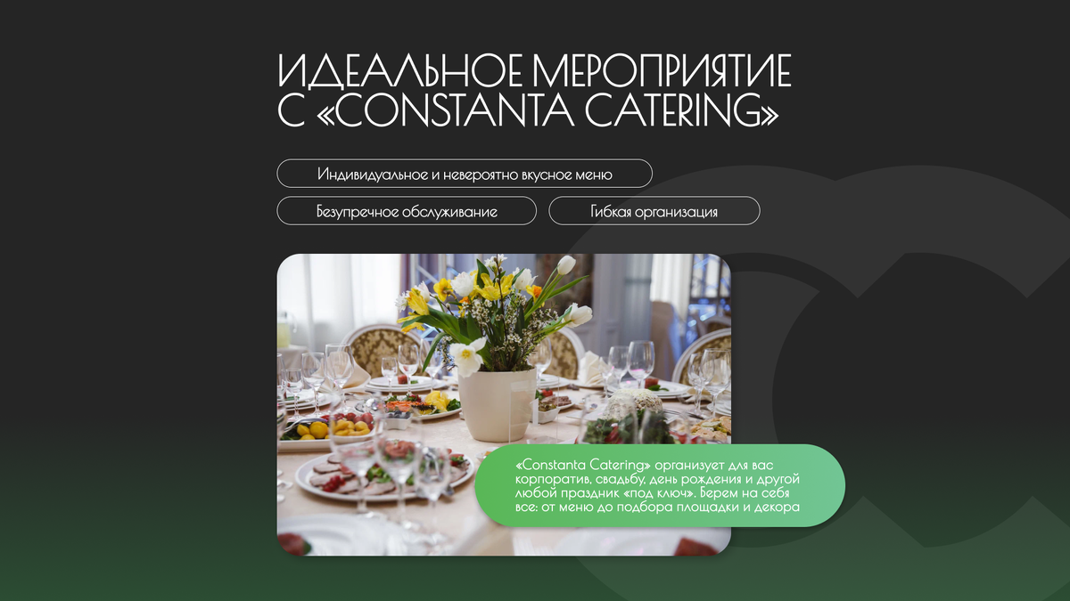 Команда профессионалов, которая продумает каждую деталь вашего праздника – команда «Constanta Catering»! Мы гарантируем сервис высокого уровня и отвечаем за качество, чтобы ваше мероприятие стало незабываемым. Что мы предлагаем? Индивидуальное и невероятно вкусное меню: мы приготовим любые блюда на ваш вкус, учитывая все предпочтения ваших гостей. Безупречное обслуживание: внимание к деталям на высшем уровне. Каждый аспект праздника будет продуман до мелочей, чтобы вам оставалось только наслаждаться моментом. Гибкая организация: мы составим план под любой повод и бюджет, обеспечивая безупречное проведение любого события. Константа Кейтеринг организует для вас корпоратив, свадьбу, день рождения или любой другой праздник «под ключ». Мы берем на себя все: от меню до подбора площадки и декора. Все, что вам нужно — это наслаждаться мероприятием! За годы работы мы организовали сотни мероприятий и точно знаем, как сделать праздник особенным. В руках нашей команды — самые важные события и тор