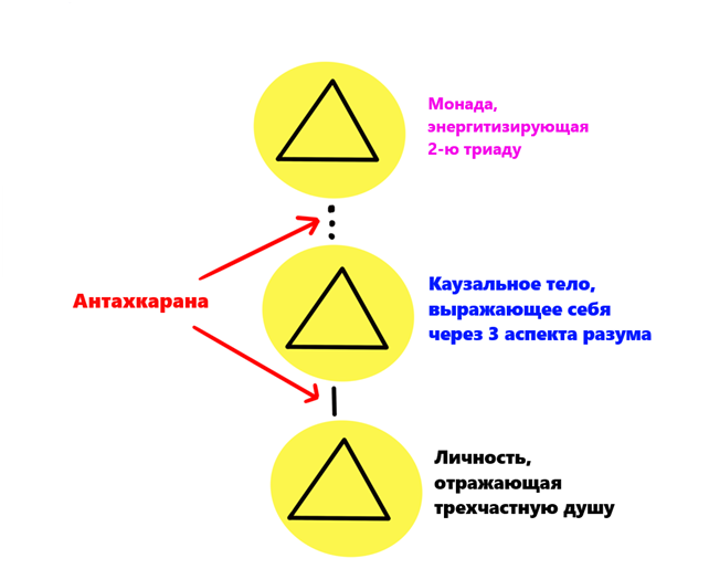 Чтобы завершить тему процесса построения Антахкараны, начатую в предыдущем изложении, ученику необходимо выполнить ряд задач. Ученик должен развить свою способность понимать, анализировать, формулировать и различать окружающее. Он делает это, осознавая следующие ситуации: процессы понимания и то, как они сочетаются с его силой; своё положение на пути, или осознание имеющихся в его распоряжении ресурсов, особенно доступных энергий. Он также должен начать слияние или интеграцию нитей Сознания, Творения и Жизни. Всё это синтезируется в творческую активность в трёх мирах первой триады. Благодаря этому творческому действию создаётся фокусная точка, ведущая к цели всего процесса – построению Антахкараны. Это происходит, когда монада, присутствующая во второй триаде, взаимодействует с первой триадой. Душа и персона приходят в союз. Это создаёт три точки божественной энергии, которые символизируются следующим образом.