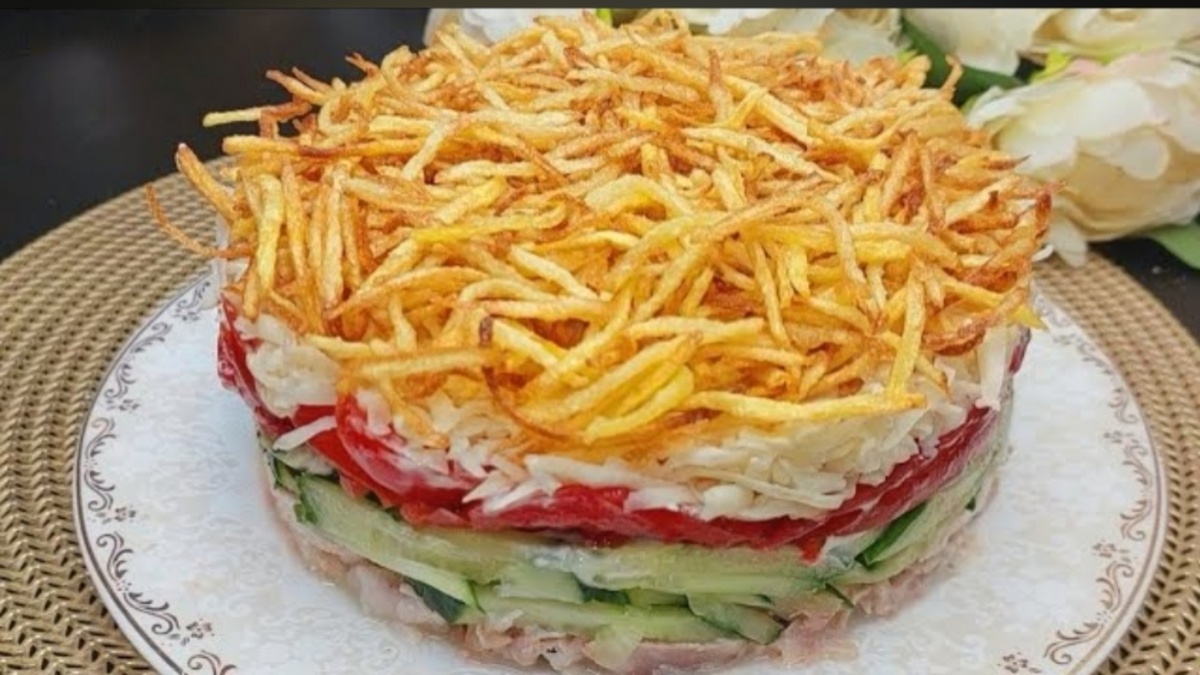 # 🥗 Салат с картофельной соломкой ## ✅ Ингредиенты: ### Для салата: * Куриное филе — 250–300 г * Огурцы свежие — 2 шт * Помидоры — 2–3 шт * Яйца — 3 шт * Сыр твёрдый — 100–120 г * Майонез — по вкусу * Соль, перец — по вкусу ### Для хрустящей картошки: * Картофель — 2 шт * Масло для жарки # 🍽 Приготовление ## 1. Подготовьте картофельную соломку 1. Очистите картофель. 2. Нарежьте тонкой соломкой (как на картофель фри). 3. Промойте в холодной воде, обсушите. 4. Обжарьте до золотистой корочки. 5. Выложите на салфетки, чтобы убрать лишний жир. ## 2. Подготовьте остальные ингредиенты * Куриное филе нарежьте маленькими кубиками или волокнами. * Можно отварить, пожарить или запечь. * Огурцы нарежьте соломкой. * Помидоры — кольцами или полукольцами. * Яйца сварите и натрите на тёрке. * Сыр также натрите на тёрке. ## 3. Сборка салата (слоями, как на фото) Используйте разъёмное кольцо для аккуратной формы. ### Слои: 1️⃣ Курица – Добавьте немного соли и майонеза. 2️⃣ Огурцы