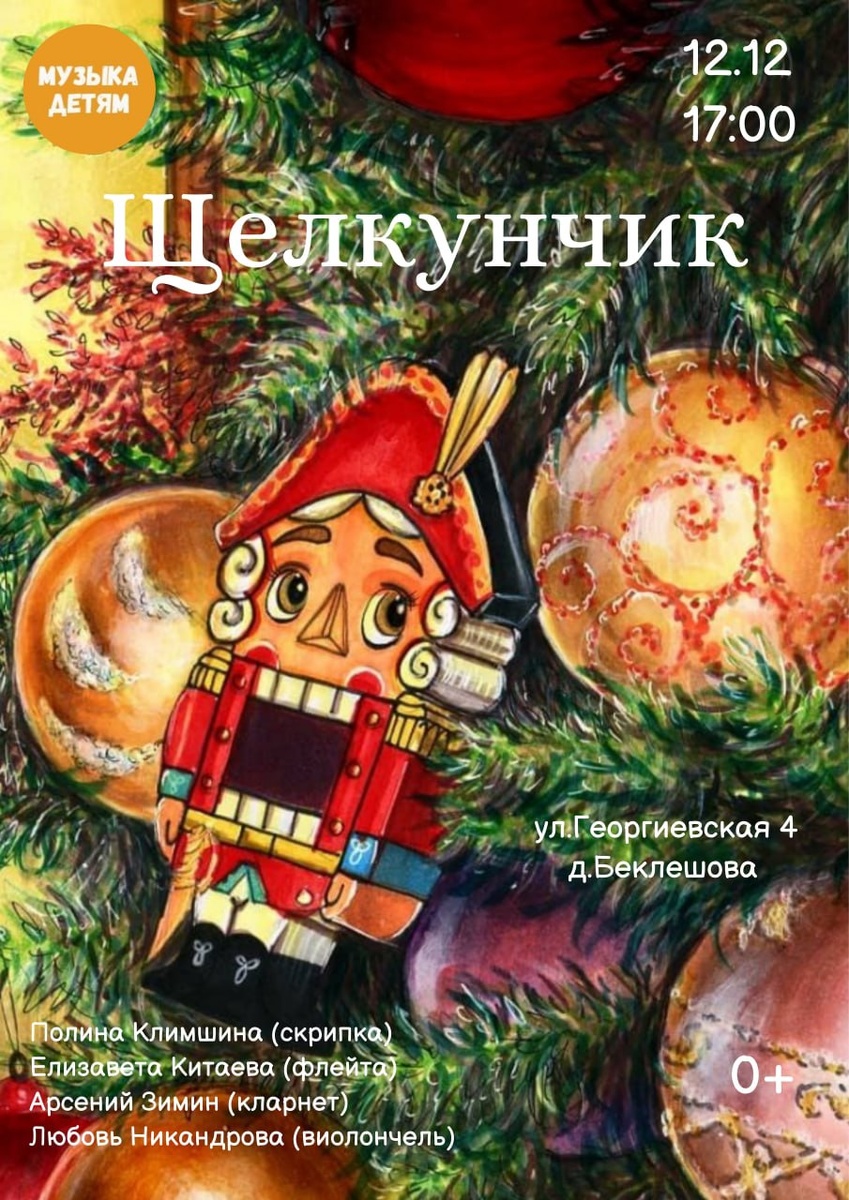 Музыкальный концерт в исполнении квартета скрипки, флейты, кларнета и виолончели «Щелкунчик» 🎼 🎈 Юные слушатели познакомятся с музыкальными инструментами и услышат любимые мелодии из балета «Щелкунчик» Чайковского. Выступят: Полина Климшина (скрипка), Елизавета Китаева (флейта), Арсений Зимин (кларнет), Любовь Никандрова (виолончель). 📆 12 декабря в 17:00. 📍 Дом Беклешова. Псков, Георгиевская, 4. 🎟 Стоимость: 400 рублей. Оставайтесь с нами #НашаПсковскаяобласть