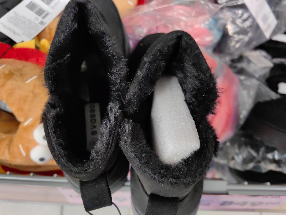 Снега нет, но зимние теплые новинку уже в магазине Чижик. Что привезли? Выставили женские ботинки, укорочены, украшены пушистым искусственным мехом. Внутри такой же меж, снаружи покрытие, как замша. Подошва не низкая, резиновая. Размеры таких ботинок от 37 по 41, на вид не маломерки, единственное, если нужен теплый носок, то лучше примерить на размер больше. Это полусапоги, похожи на дутики. Женская обувь. Застегиваются на молнию, сверху утяжка, чтобы снег и холодный воздух не попадали. Это тоже зимняя обувь. Не черные, дутики темно-серые. Внутри густой белый искусственный мех. Низ и пятка прикрыты вставкой из искусственной кожи, прошито в две строчки (похоже). Подошва на вид не тонкая, рельеф неплохой. Не протестировать, снега нет... В корзинах с обувью все переставлено, дутики за 1499р. Перчатки женские, заявлены как шерстяные. Хороший выбор по расцветке, от серо-голубых до белых и черных. Перчатки с узором - снежинки. Размер один, указан как 17. В составе пряж