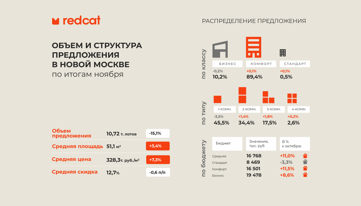 В Новой Москве в ноябре на рынок вышли 6 новых корпусов, также предложение пополнялось за счет новых объемов в уже реализуемых проектах. Несмотря на выход новых корпусов, объемы предложения в Новой Москве снова существенно снизились и обновили минимальные значения, предыдущий минимум был в феврале 2022 года, тогда здесь предлагалось 10,65 тыс. лотов. Общее количество лотов, находящихся в экспозиции в ноябре, сократилось на 15,1%, объем предложения зафиксировался на показателе 10,72 тыс. лотов, что уже на 43,7% ниже уровня ноября прошлого года. В структуре предложения по классам в ноябре отмечено смещение в сторону доступных проектов, в течение месяца объемы экспозиции в бизнес-классе сокращались более активно. Доля квартир бизнес-класса снизилась на 0,2 п/п и составила 10,2%, доля комфорт-класса поднялась на 0,1 п/п до уровня 89,4%, доля стандарт-класса подросла на 0,1 п/п и остановилась на показателе 0,5%. В структуре предложения по количеству комнат отмечен сдвиг в сторону более