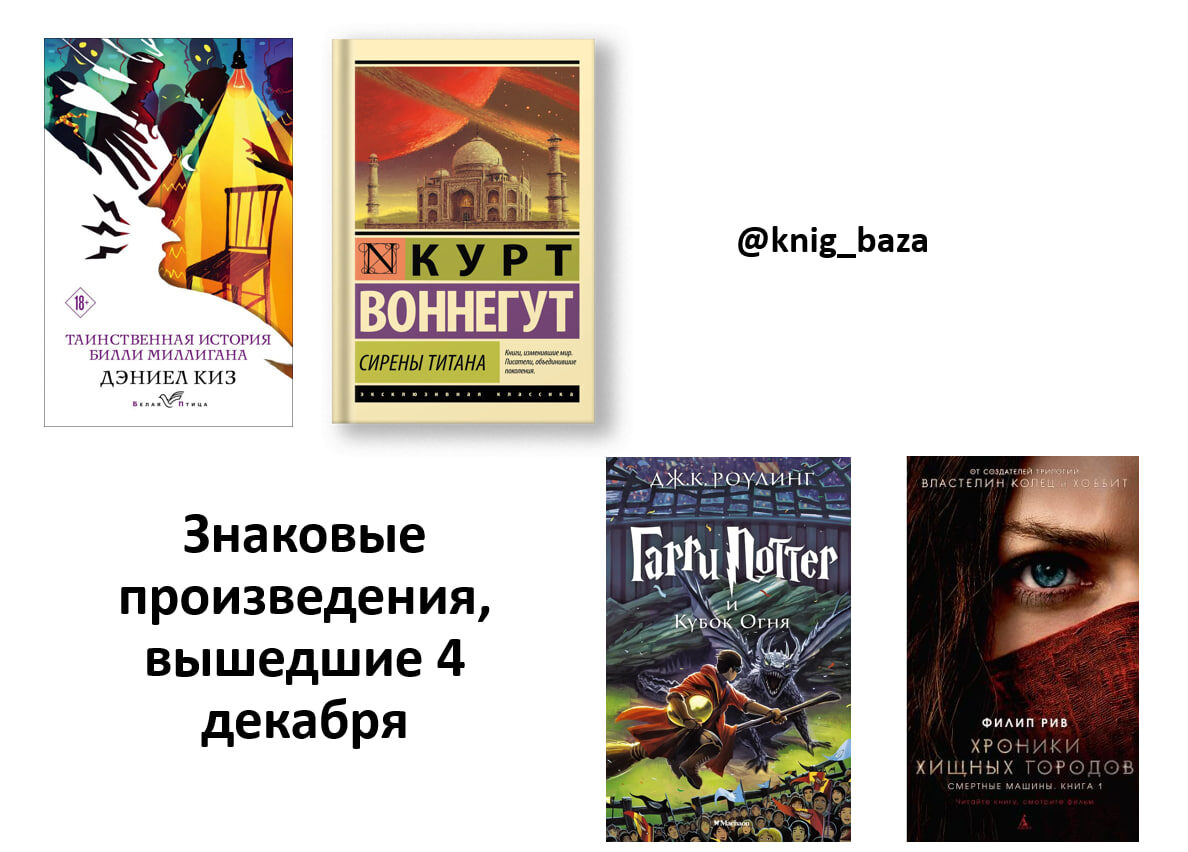1.«Гарри Поттер и Кубок огня» Дж. К. Роулинг (2000) Переломный момент в культовой серии. Книга, где сказка превращается в эпическую историю взросления с настоящим ужасом и жертвами. Это точка, после которой мир Гарри Поттера становится серьезнее, сложнее и опаснее. Выход этой книги был глобальным событием. 2. «Таинственная история Билли Миллигана» Дэниела Киза (1981) Основанная на реальных событиях захватывающая документальная история человека с 24 разными личностями. Киз, автор «Цветов для Элджернона», мастерски исследует тему расщепления сознания, заставляя задуматься о природе личности, травме и человеческой психике. 3.«Сирены Титана» Курта Воннегута (1959) Один из ранних и самых остроумных романов Воннегута. Фантастическая сага о самом богатом человеке на Земле, отправившемся в космическое путешествие, чтобы найти смысл жизни. Классика гуманистической научной фантастики, полная абсурда, иронии и глубоких мыслей о свободе воли и устройстве Вселенной. 4.«Хроники хищных городов» Фил