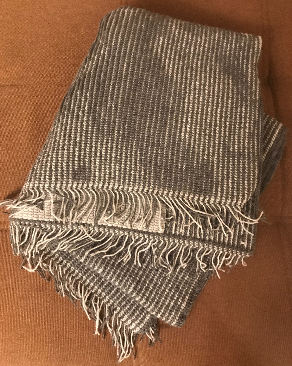 Я раскрасила свой понедельник всё тем же серым цветом, но меланж обоих серых оттенков играет бликами, поднимая настроение, а небольшие прибавки полотна пледа «Под защитой» приближают к его завершению.