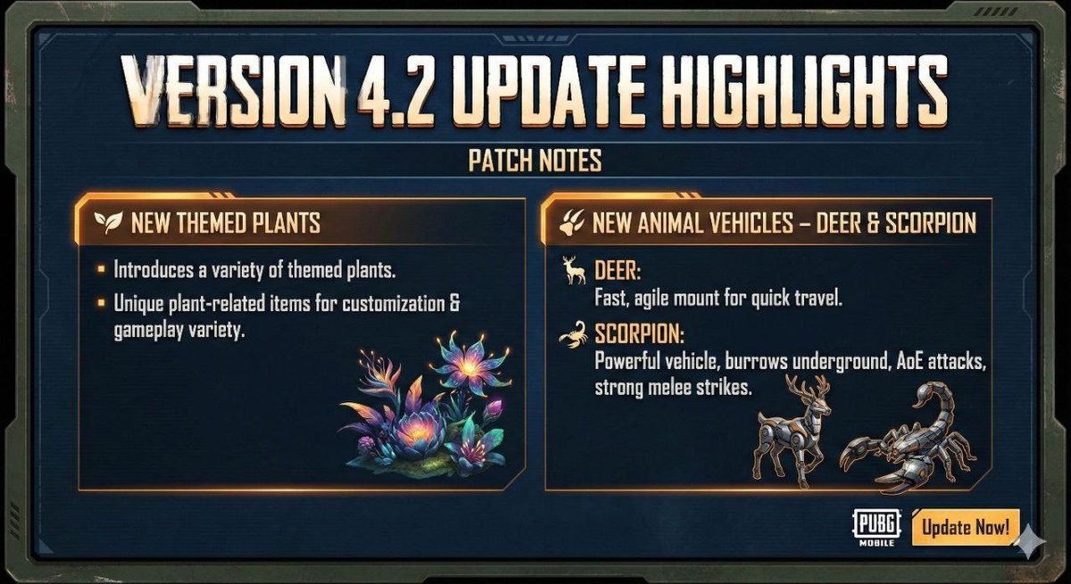 Бета-тест В обновлении 4.2 нас ждёт несколько интересных нововведений. Во-первых, вернут уже знакомого ездового Оленя. Во-вторых, добавят нового Скорпиона — и это не просто транспорт, а полноценная боевая машина. Появятся и какие-то «странные» растения, которые будут влиять на геймплей — как именно, узнаем уже в бете. Всё это можно будет протестировать заранее. Наш бот для пополнения UC: @OneTwoPay_bot 😎 PUBG Mobile