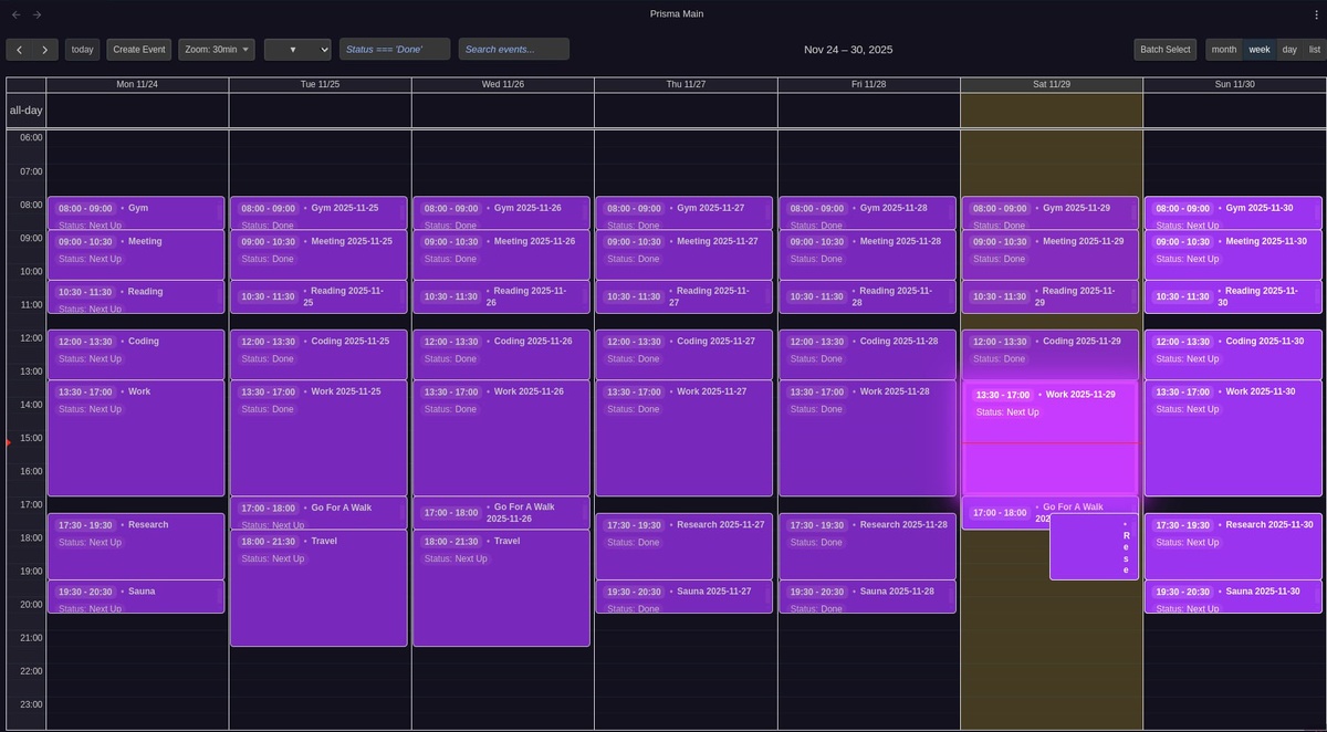 📅 Prisma Calendar - прокачанный календарь внутри Obsidian 🔧 Что умеет *⃣Поддерживает несколько отдельных календарей - удобно, если у вас разные потоки: задачи, проекты, личное, события и пр. *⃣Универсальный подход: календарь сканирует папки хранилища и находит события по frontmatter - вы можете настроить, какие поля будут “даты/время”. *⃣Поддерживает повторяющиеся события: можно задать шаблон и генерировать события на нужный срок. *⃣Мощные цветовые правила и фильтры - можно задать логику покраски заметок/событий по приоритету, категории, тегам и пр. *⃣Удобное групповое редактирование: выделили несколько событий - переместили, клонировали, удалили, пропустили - все одним действием. *⃣Любые изменения конфигурации, frontmatter, фильтров - сразу отражаются, без перезагрузки Obsidian. ✅ Кому особенно пригодится *⃣Тем, кто ведёт проекты, задачи или расписание в Obsidian и хочет видеть всё в одном календарном окне. *⃣Если хочется объединить заметки + задачи + события в единой экосистеме,
